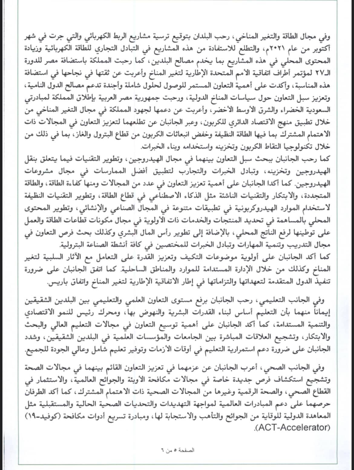 وفي مجال الطاقة والتغير المناخي، رحب البلدان بتوقيع ترسية مشاريع الربط الكهربائي والتي جرت في شهر أكتوبر من عام 2021م، والتطلع للاستفادة من هذه المشاريع في التبادل التجاري للطاقة الكهربائية وزيادة المحتوى المحلي في هذه المشاريع بما يخدم مصالح البلدين، كما رحبت المملكة باستضافة مصر للدورة الـ27 لمؤتمر أطراف اتفاقية الأمم المتحدة الإطارية لتغير المناخ وأعربت عن ثقتها في نجاحها في استضافة هذه المناسبة، وأكدت على أهمية التعاون المستمر للوصول لحلول شاملة وأجندة تدعم مصالح الدول النامية، وتعزيز سبل التعاون حول سياسات المناخ الدولية، ورحبت جمهورية مصر العربية بإطلاق المملكة لمبادرتي السعودية الخضراء والشرق الأوسط الأخضر، وأعربت عن دعمها لجهود المملكة في مجال التغير المناخي من خلال تطبيق منهج الاقتصاد الدائري للكربون، وعبر الجانبان عن تطلعهما لتعزيز التعاون في المجالات ذات الاهتمام المشترك بما فيها الطاقة النظيفة وخفض انبعاثات الكربون من قطاع البترول والغاز، بما في ذلك من خلال تكنولوجيا التقاط الكربون وتخزينه واستخدامه وبناء الخبرات.