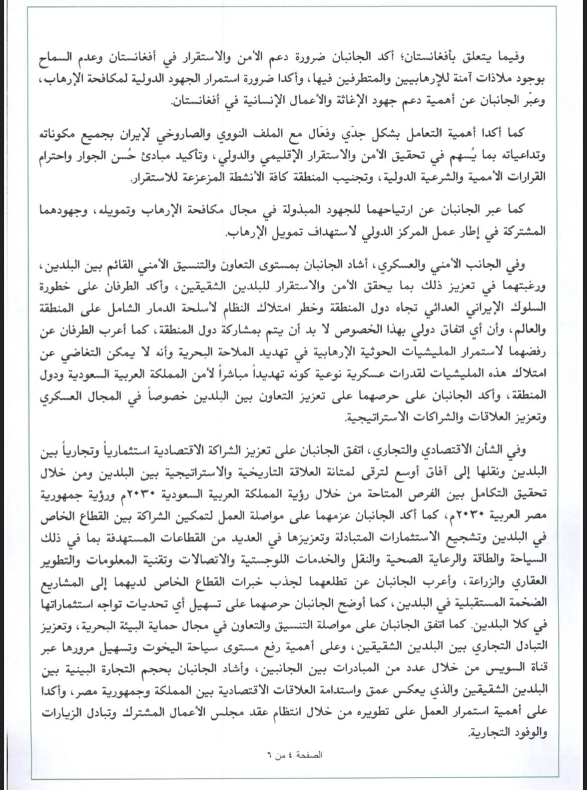 ونوه الجانب المصري بمبادرة المملكة العربية السعودية لإنهاء الأزمة اليمنية ورفع المعاناة الإنسانية عن الشعب اليمني الشقيق.، ورحب الجانبان بإصدار مجلس الأمن الدولي القرار (2624) لعام 2022م الذي صنف فيه مليشيا الحوثي جماعة إرهابية، بالإضافة إلى توسيع الحظر على إيصال الأسلحة إلى اليمن ليشمل جميع أفراد جماعة الحوثي الإرهابية، كما أشاد الجانبان في الوقت ذاته بالدور الكبير الذي يقوم به مركز الملك سلمان للإغاثة والأعمال الإنسانية لرفع المعاناة الإنسانية عن الشعب اليمني الشقيق.