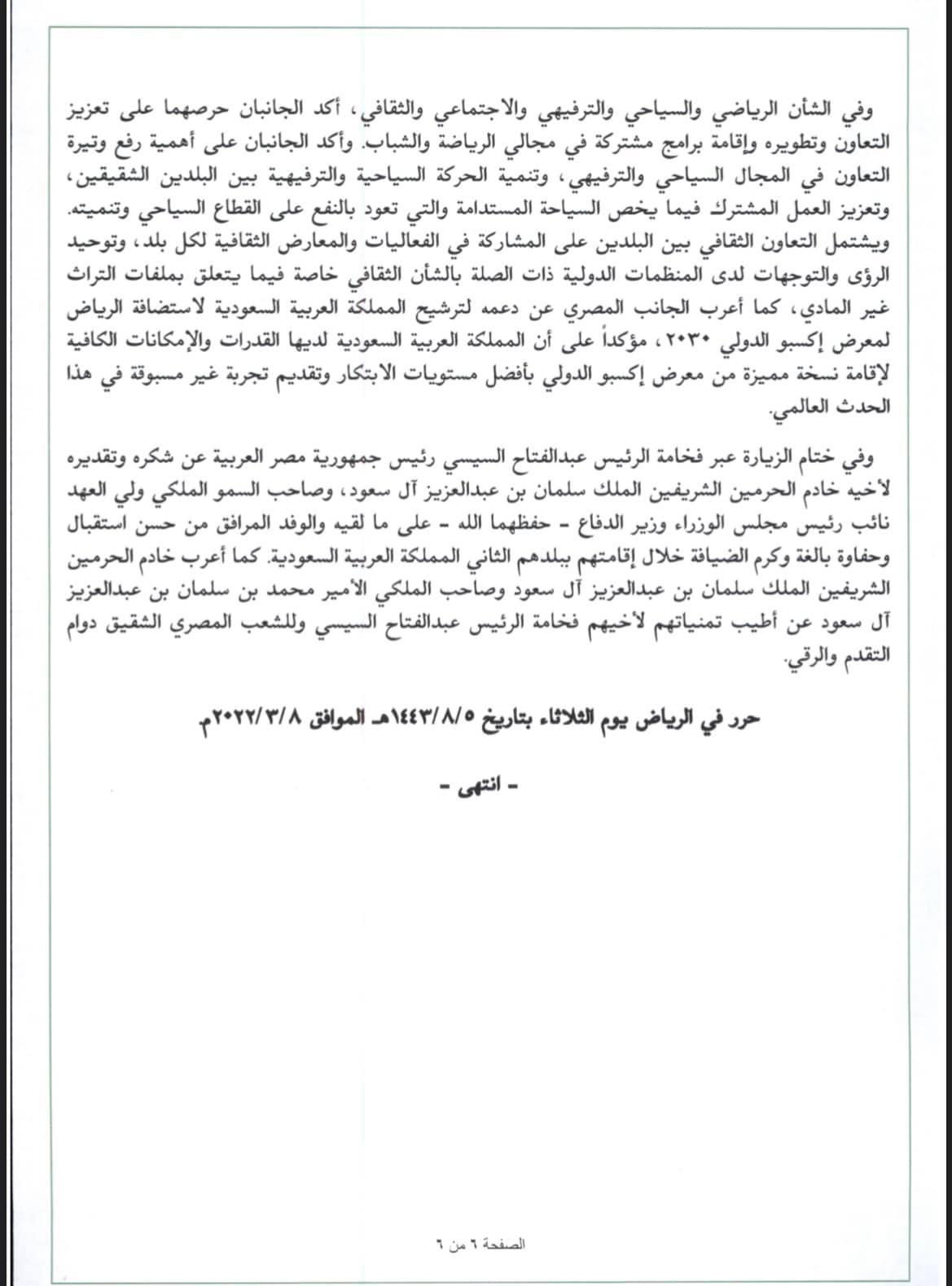 وفي الشأن الرياضي والسياحي والاجتماعي والثقافي، أكد الجانبان حرصهما على تعزيز التعاون وتطويره وإقامة برامج مشتركة في مجالي الرياضة والشباب. وأكد الجانبان على أهمية رفع وتيرة التعاون في المجال السياحي وتنمية الحركة السياحية بين البلدين الشقيقين، وتعزيز العمل المشترك فيما يخص السياحة المستدامة والتي تعود بالنفع على القطاع السياحي وتنميته. ويشتمل التعاون الثقافي بين البلدين على المشاركة في الفعاليات والمعارض الثقافية لكل بلد، وتوحيد الرؤى والتوجهات لدى المنظمات الدولية ذات الصلة بالشأن الثقافي خاصة فيما يتعلق بملفات التراث غير المادي، كما أعرب الجانب المصري عن دعمه لترشيح المملكة العربية السعودية لاستضافة الرياض لمعرض إكسبو الدولي 2030، مؤكدًا على أن المملكة العربية السعودية لديها القدرات والإمكانات الكافية لإقامة نسخة مميزة من معرض إكسبو الدولي بأفضل مستويات الابتكار وتقديم تجربة غير مسبوقة في هذا الحدث العالمي.