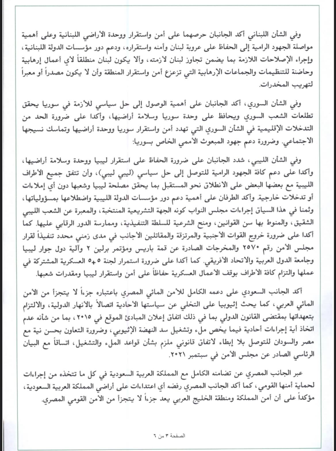 وفي الشأن الليبي، شدد الجانبان على ضرورة الحفاظ على استقرار ليبيا ووحدة وسلامة أراضيها، وأكدا على دعم كافة الجهود الرامية للتوصل إلى حل سياسي (ليبي ليبي)، وأن تتفق جميع الأطراف الليبية مع بعضها البعض على الانطلاق نحو المستقبل بما يحقق مصلحة ليبيا وشعبها دون أي إملاءات أو تدخلات خارجية. وأكد الطرفان على أهمية دعم دور مؤسسات الدولة الليبية واضطلاعها بمسؤولياتها، وثمنا في هذا السياق إجراءات مجلس النواب كونه الجهة التشريعية المنتخبة، والمعبرة عن الشعب الليبي الشقيق، والمنوط بها سن القوانين، ومنح الشرعية للسلطة التنفيذية، وممارسة الدور الرقابي عليها. كما أكدا على ضرورة خروج القوات الأجنبية والمرتزقة والمقاتلين الأجانب في مدى زمني محدد تنفيذًا لقرار مجلس الأمن رقم 2570 والمخرجات الصادرة عن قمة باريس ومؤتمر برلين 2 وآلية دول جوار ليبيا وجامعة الدول العربية والاتحاد الأفريقي. كما أكدا على ضرورة استمرار لجنة 5+5 العسكرية المشتركة في عملها والتزام كافة الأطراف بوقف الأعمال العسكرية حفاظًا على أمن واستقرار ليبيا ومقدرات شعبها.