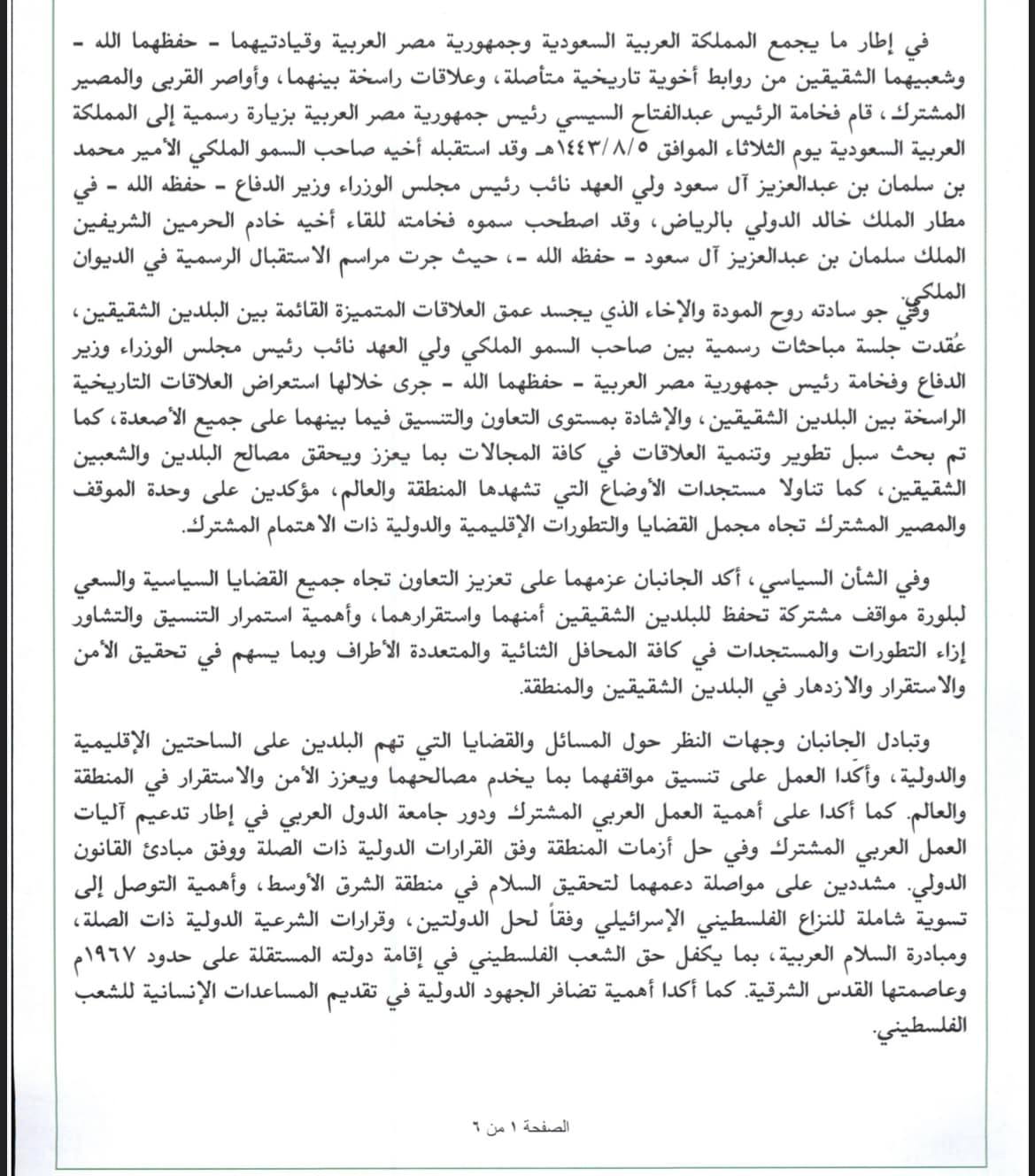 في إطار ما يجمع المملكة العربية السعودية وجمهورية مصر العربية وقيادتيهما - حفظهما الله - وشعبيهما الشقيقين من روابط أخوية تاريخية متأصلة، وعلاقات راسخة بينهما وأواصر القربى والمصير المشترك قام الرئيس عبد الفتاح السيسي رئيس جمهورية مصر العربية بزيارة رسمية إلى المملكة العربية السعودية يوم الثلاثاء 5 / 8 / 1443هـ وقد استقبله الأمير محمد بن سلمان بن عبد العزيز آل سعود ولي العهد نائب رئيس مجلس الوزراء وزير الدفاع حفظه الله - في مطار الملك خالد الدولي بالرياض وقد اصطحب سموه فخامته للقاء أخيه خادم الحرمين الشريفين الملك سلمان بن عبد العزيز آل سعود - حفظه الله -، حيث جرت مراسم الاستقبال الرسمية في الديوان الملكي.