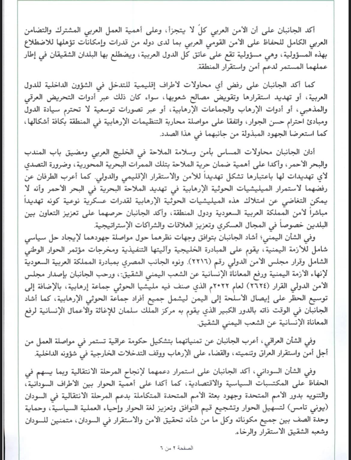 وأكد الجانبان على أن الأمن العربي كل لا يتجزأ وعلى أهمية العمل العربي المشترك والتضامن العربي الكامل للحفاظ على الأمن القومي العربي بما لدى دوله من قدرات وإمكانات تؤهلها للاضطلاع بهذه المسؤولية وهي مسؤولية تقع على عاتق كل الدول العربية، ويضطلع بها البلدان الشقيقان في إطار عملهما المستمر لدعم أمن واستقرار المنطقة.