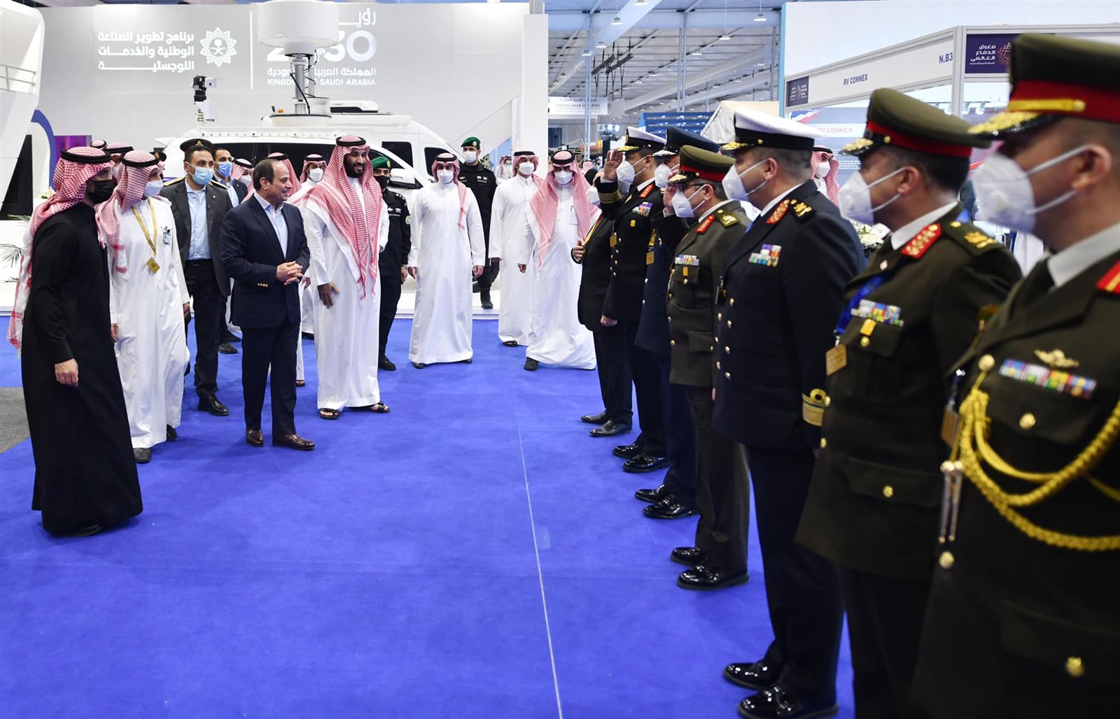 كما أجرى الرئيس عبد الفتاح السيسي جولة تفقدية في معرض الدفاع العالمي بصحبة سمو الأمير محمد بن سلمان، ولي عهد المملكة العربية السعودية، وهو المعرض الذي يمثل منصة عالمية في قطاع التصنيع الدفاعي، وتُعرض خلاله أحدث التطورات التكنولوجية في هذا المجال من جميع أنحاء العالم".