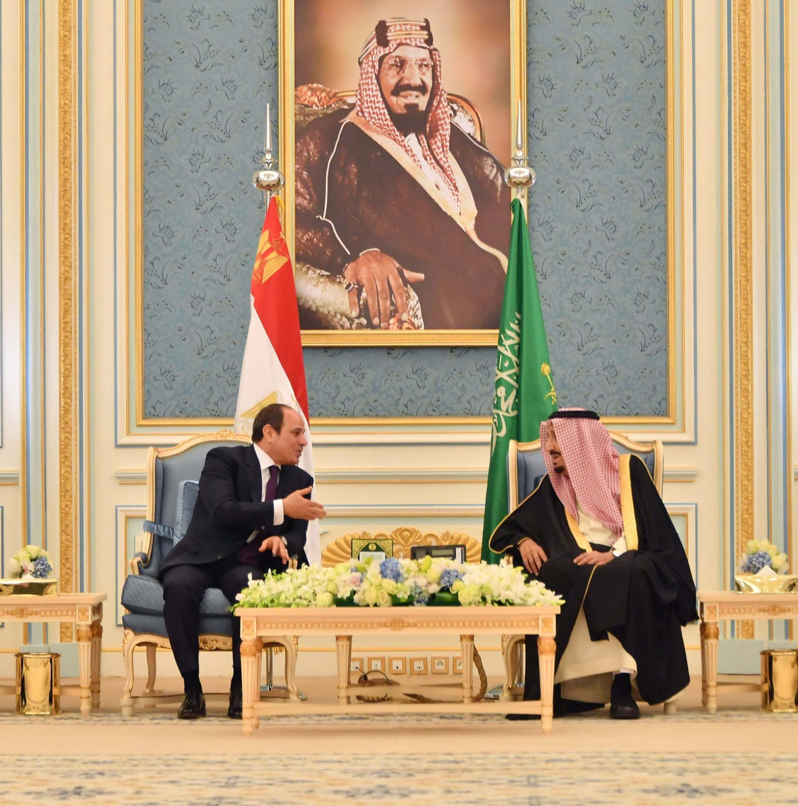 وأكد السفير بسام راضي المتحدث الرسمي باسم رئاسة الجمهورية، أن اللقاء شهد عقد مباحثات منفردة بين الزعيمين، تلتها جلسة مباحثات موسعة ضمت وفدي البلدين، حيث أعرب الملك سلمان بن عبد العزيز عن ترحيب المملكة العربية السعودية قيادة وشعبًا بزيارة الرئيس، مؤكدًا ما تتسم به العلاقات المصرية السعودية من تميز وخصوصية، ومشيدًا في هذا الإطار بدور مصر المحوري في المنطقة العربية، وجهودها الحثيثة لمساندة ودعم الدول العربية والخليجية على وجه الخصوص، وذلك كركيزة أساسية لصون الأمن والاستقرار في الوطن العربي.