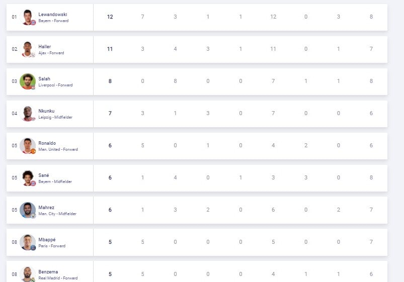 وصعد الألماني ليروي ساني مهاجم بايرن ميونخ للمركز الخامس برصيد 6 أهداف رفقة البرتغالي كريستيانو رونالدو مهاجم مانشستر يونايتد والجزائري رياض محرز جناح مانشستر سيتي وسجل الألماني أحد أهداف فريقه السبعة.
