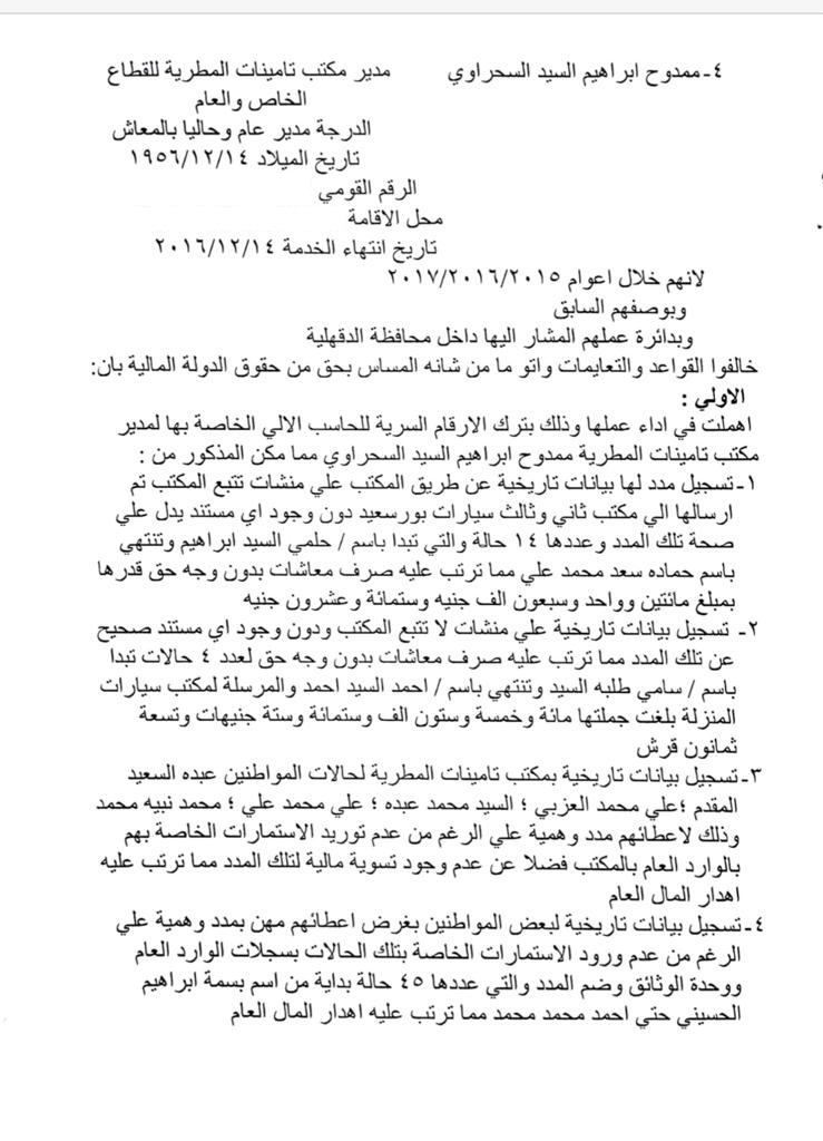 وأكدت النيابة الإدارية قيام المتهم الرابع ممدوح إبراهيم السيد، مدير مكتب تأمينات المطرية بالدقهلية للقطاعين العام والخاص، بتسجيل مدد لها بيانات تاريخية على منشآت تتبع المكتب رئاسته تم إرسالها إلى مكتب ثان وثالث سيارات بور سعيد دون وجود أي مستند يدل على صحة تلك المدد وعددها 14 حالة مما ترتب عليه صرف معاشات بدون وجه حق لهم بلغت جملتها 272 ألف جنيه.