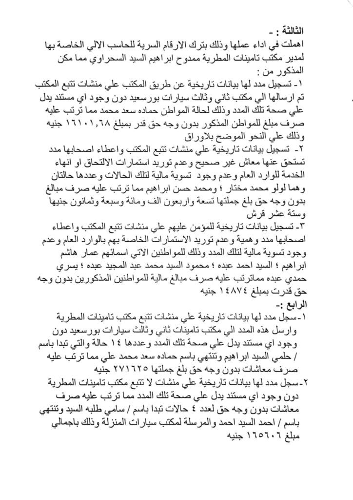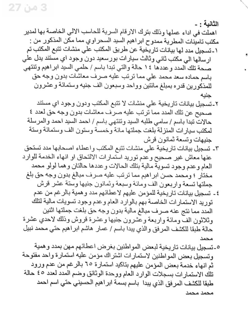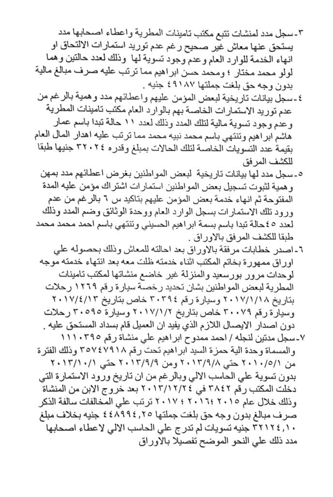كما سجل بيانات على منشأت لا تتبع المكتب ودون أي وجود مستند صحيح عن تلك المدد مما ترتب عليه صرف معاشات لعدد 4 حالات والمرسلة لمكتب سيارات المنزلة بلغت جملتها 165 ألف جنيه، بالإضافة إلى تسجيل بيانات تاريخية لحالات 5 مواطنين، بقصد إعطائهم مدد وهمية رغم عدم توريد الإستمارات الخاصة بهم بالوارد العام للمكتب، فضلًا عن عدم وجود تسوية مالية لتلك المدد مما ترتب عليه إهدار المال العام.