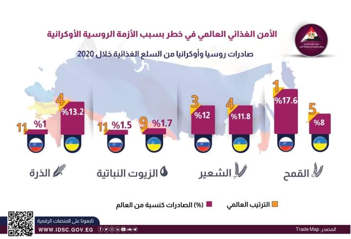 نشرت الصفحة الرسمية لمركز المعلومات ودعم اتخاذ القرار بمجلس الوزراء عبر موقع التواصل الاجتماعي فيسبوك إنفوجراف بعنوان “الأمن الغذائي العالمي في خطر بسبب الأزمة الروسية الأوكرانية”.