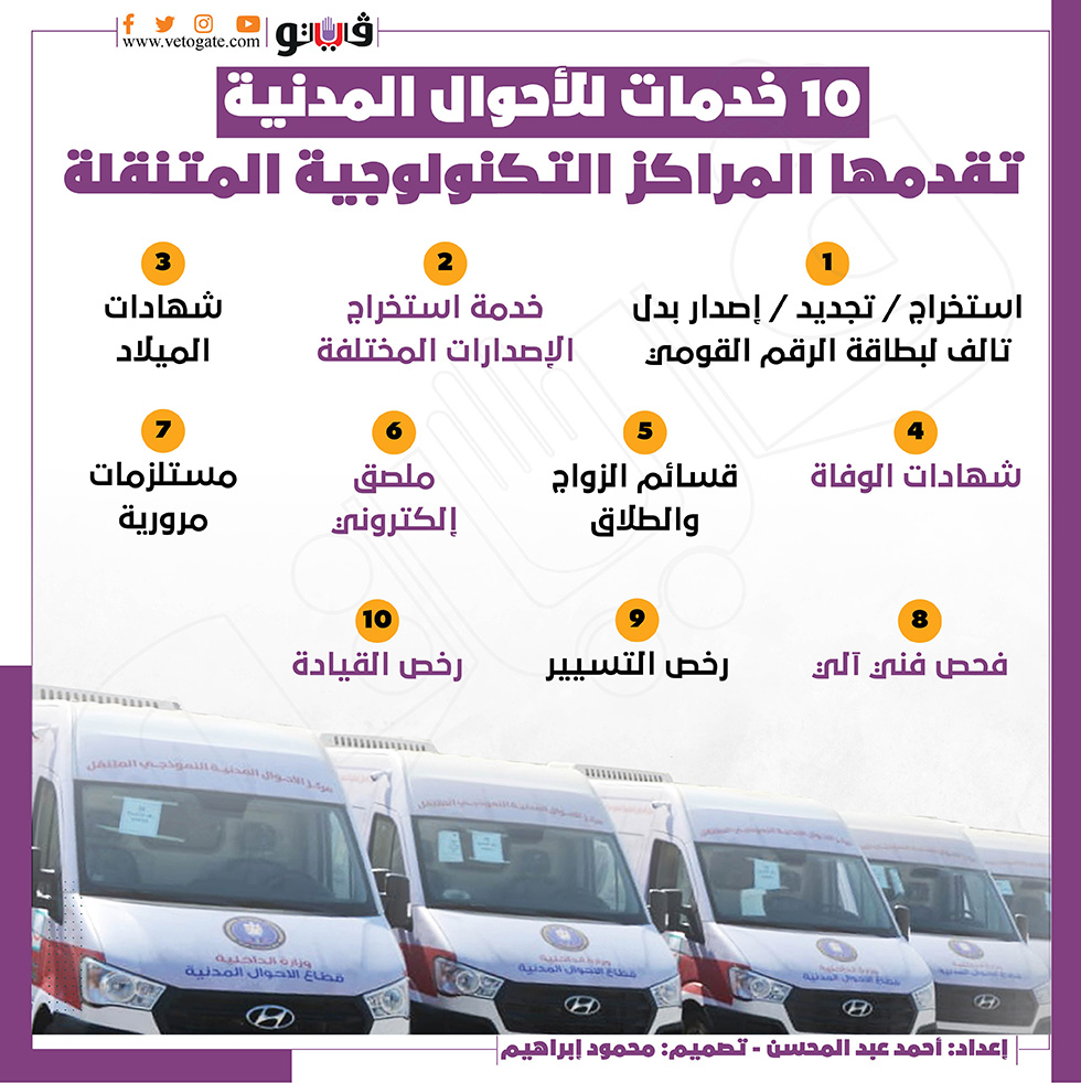 10 خدمات للأحوال المدنية تقدمها المراكز التكنولوجية المتنقلة| انفوجراف الخميس 10/مارس/2022 - 01:00 م 3/10/2022 1:00:32 PM خدمات المراكز التكنولوجية المتنقلة أحمد عبدالمحسن شارك طباعة 18 حجم الخط شارك طباعة المراكز التكنولوجية بطاقة الرقم القومى الاحوال المدنية مراكز التكنولوجية ملصق الكتروني شهادات الميلاد المراكز التكنولوجية المتنقلة