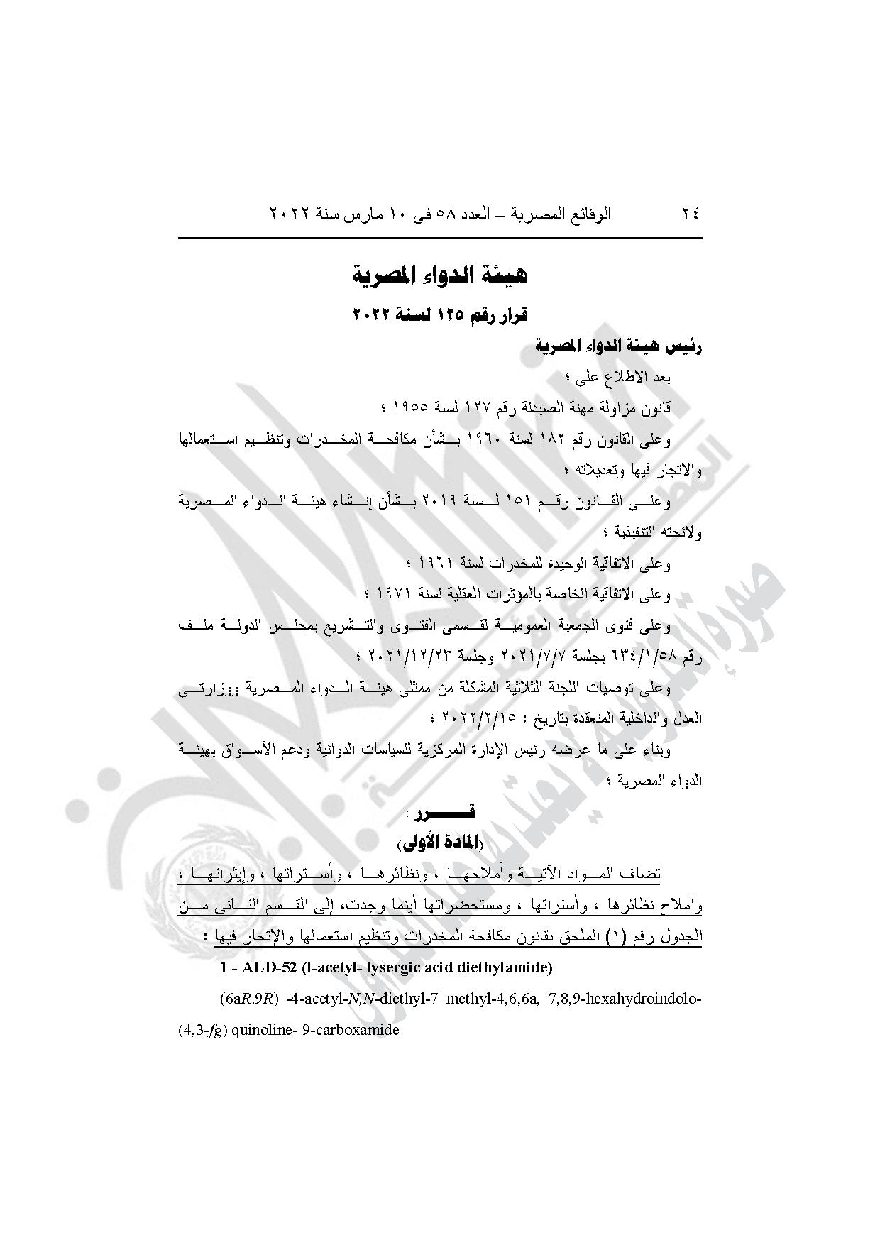 نشرت جريدة الوقائع المصرية في عددها رقم 58، الصادر في 10 مارس 2022، قرار هيئة الدواء المصرية رقم 125 لسنة 2022، بشأن إدراج 7 مواد وأملاحها ونظائرها وأستراتها وإيثيراتها وأملاح نظائرها، وأستراتها، ومستحضراتها أينما وجدت بجدول المخدرات.