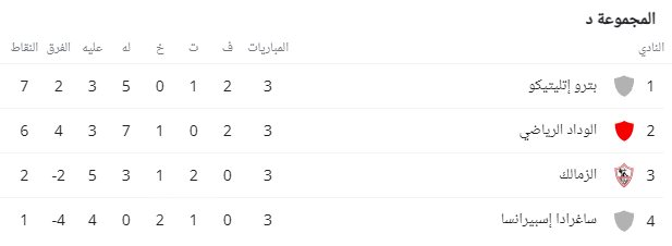 وكان الزمالك حصد نقطتين فقط خلال مشواره في دور المجموعات من تعادلين، الأول مع بترو أتلتيكو 2-2 في القاهرة، والثاني مع ساجرادا 0-0 في أنجولا، فيما خسر أمام الوداد المغربي بالمغرب في الجولة الثالثة.