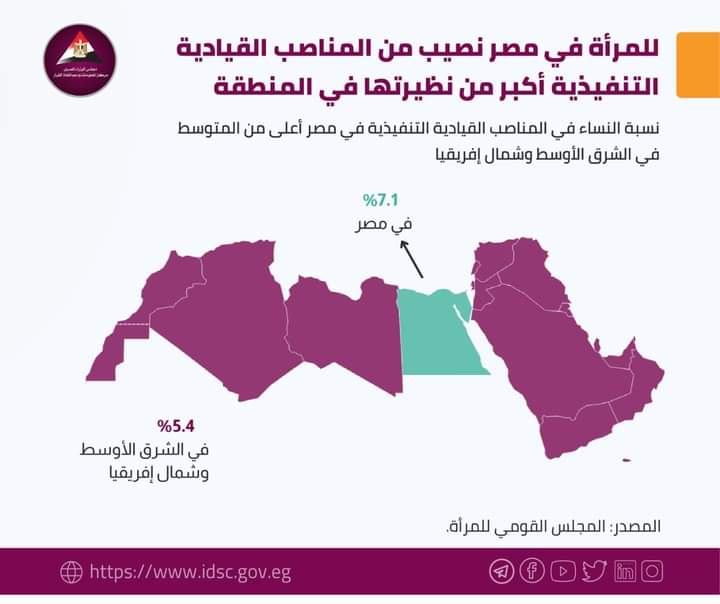 نشر مركز المعلومات ودعم اتخاذ القرار بمجلس الوزراء عبر صفحته الرسمية على موقع التواصل الاجتماعي فيسبوك، إنفوجراف، يتضمن نسبة النساء في المناصب القيادية التنفيذية في مصر مقارنة بالنسبة في الشرق الأوسط وشمال إفريقيا.
