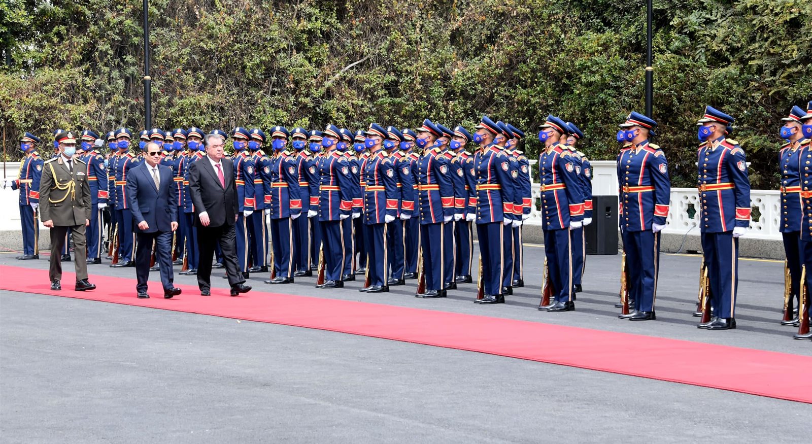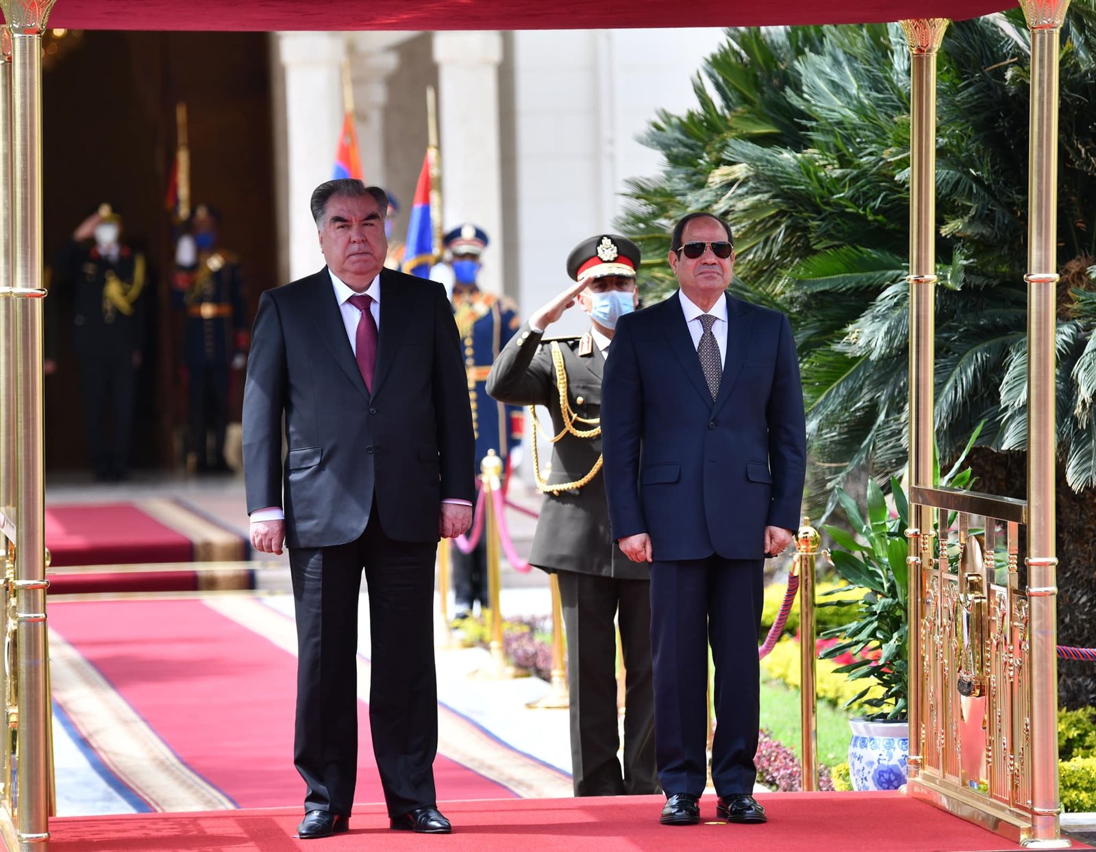 كما استقبل الرئيس عبد الفتاح السيسي بقصر الاتحادية الرئيس إمام علي رحمان، رئيس جمهورية طاجيكستان، حيث أقيمت مراسم الاستقبال الرسمي وتم عزف السلامين الوطنيين واستعراض حرس الشرف".