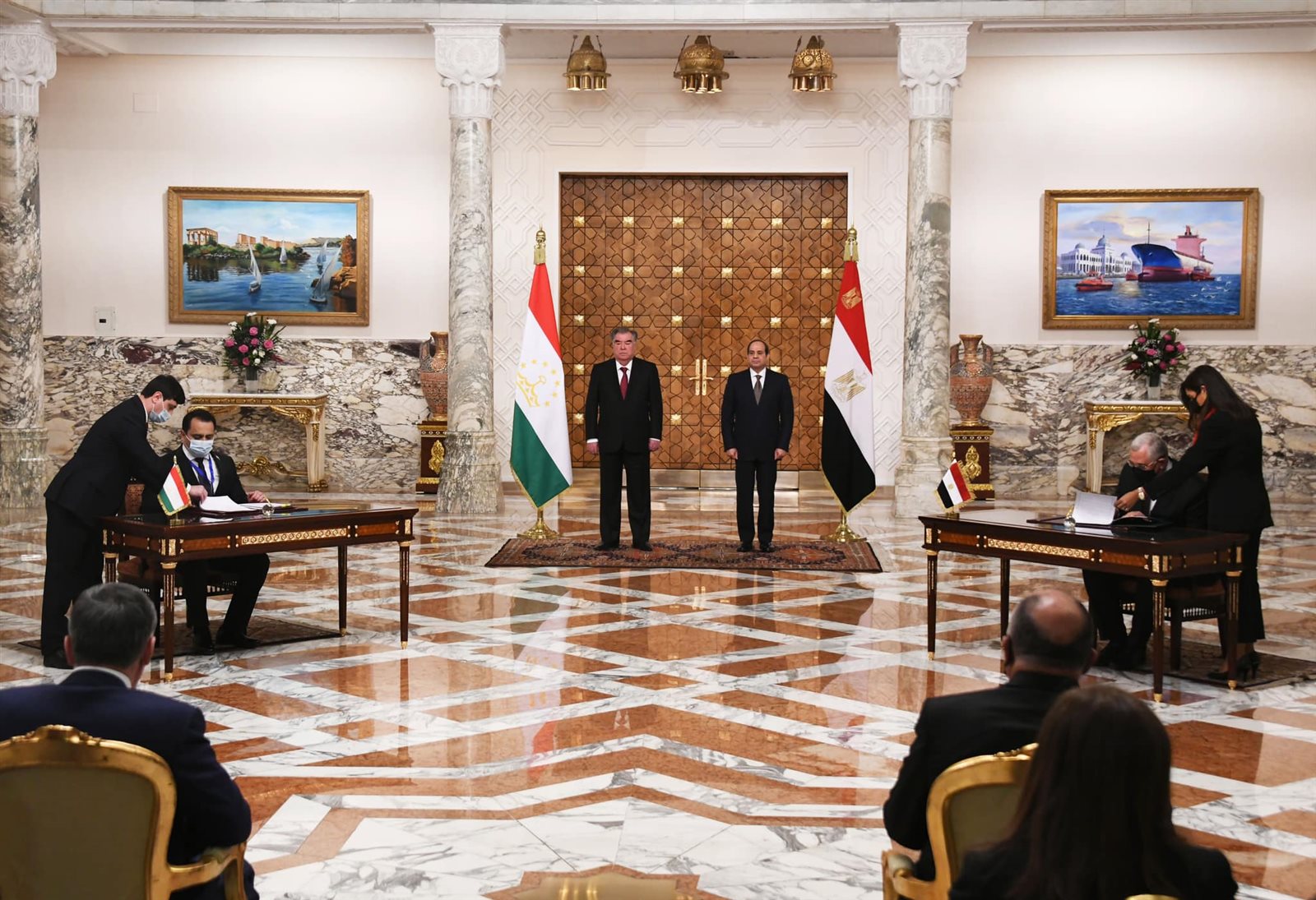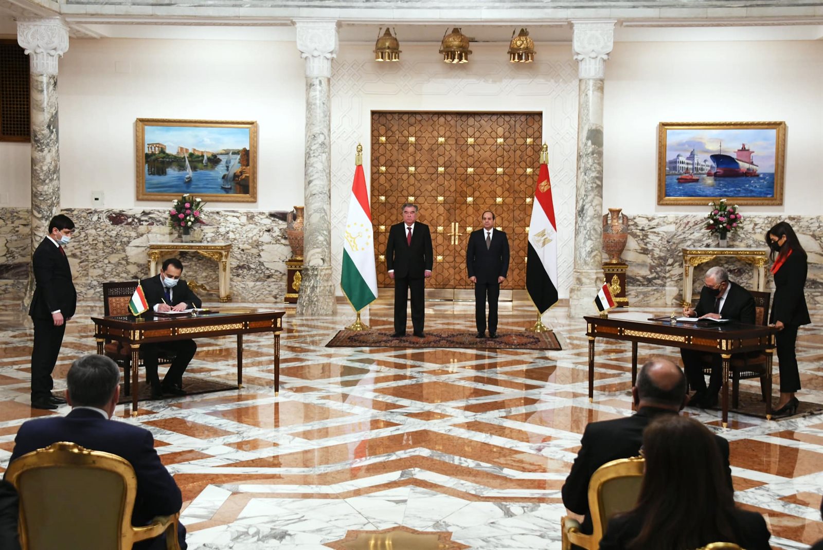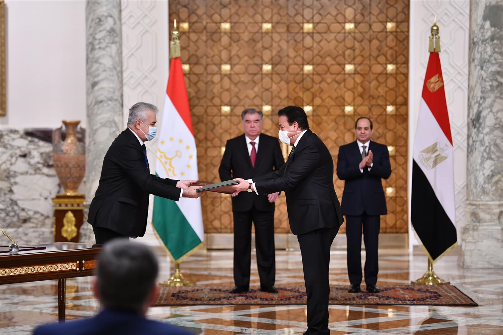 وقد شهد الرئيسان مراسم التوقيع على عدد من مذكرات التفاهم واتفاقيات التعاون بين البلدين في مجالات الزراعة، والشباب والرياضة، والتعليم العالي، إلى جانب اتفاق صداقة وتعاون بين محافظة جنوب سيناء وإقليم "كاتلون" بطاجيكستان، وكذا مذكرة تفاهم بين الهيئة العامة لدار الكتب والوثائق القومية ومكتبة طاجيكستان القومية.