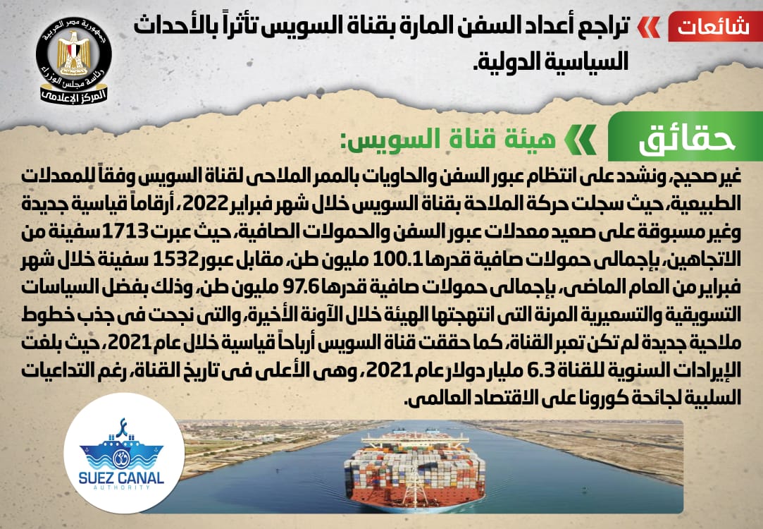 رصد المركز الإعلامي بمجلس الوزراء تداول أنباء بشأن تراجع أعداد السفن المارة بقناة السويس تأثرًا بالأحداث السياسية الدولية، وقد قام المركز الإعلامي لمجلس الوزراء بالتواصل مع هيئة قناة السويس، والتي نفت تلك الأنباء.