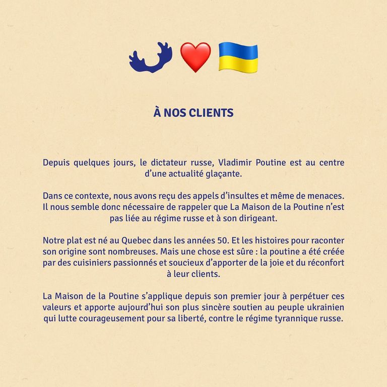 وفي فرنسا، أفاد مطعم آخر يحمل اسم "لا ميزون دو لا بوتين" (دار البوتين) في بيان بأنّه تلقى "اتصالات تنطوي على إهانات وحتى تهديدات" من أشخاص ربطوا طبق المطعم الرئيسي خطأً بالرئيس الروسي.
