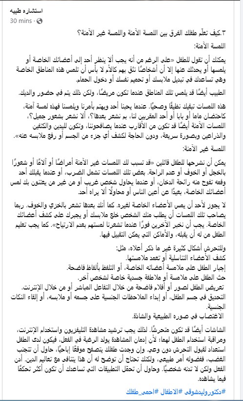 وكتب الدكتور وليد شوقي تدوينة على الفيس بوك قائلًا: "كيف تعلّم طفلك الفرق بين اللمسة الآمنة واللمسة غير الآمنة؟ اللمسة الآمنة: يمكنك أن تقول للطفل «على الرغم من أنه يجب ألا ينظر أحد إلى أعضائك الخاصة أو يلمسها أو يحدثك عنها إلا أن أشخاصًا نثق بهم كالأم لا بأس أن تلمس هذه المناطق الخاصة وهي تساعدك في تبديل ملابسك أو تحميم نفسك أو دخول الحمام".