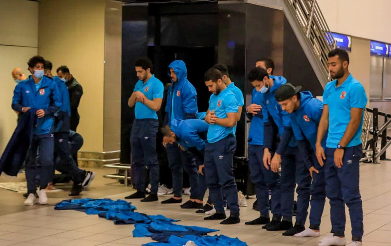 لاعبو الأهلي يؤدون الصلاة بمطار جوهانسبرج