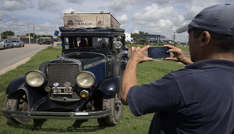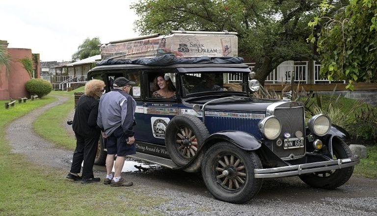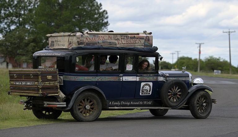 وبدأت العائلة في الرحلة بسيارة عتيقة من طراز جراهام-بيج المنتجة عام 1928 وذات اطارات مغلفة بالخشب وبالكاد قادرة على السير غير أن الزوجين أعجبا بالسيارة والتي أصبحت فيما بعد علامتهم العائلية المميزة التي تفتح كل الأبواب.