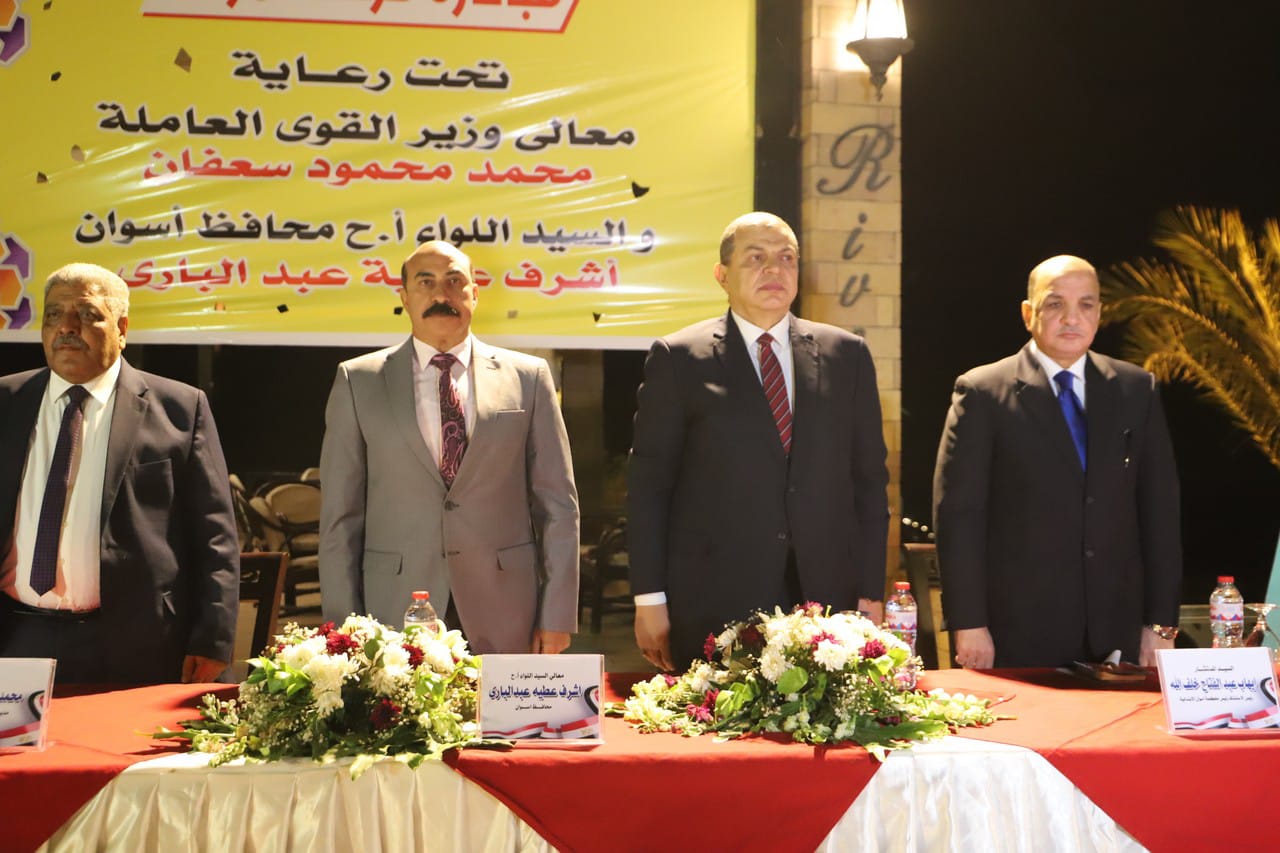 ومن جانبه رحب اللواء أشرف عطية بالوزير والحضور على أرض أسوان واصفا إياها بأرض الذهب، والتي تحتضن العديد من الفعاليات التي تقيمها وزارة القوى العاملة، مشيرا إلى أن هذا العرس الذي تقيمه وزارة القوى العاملة بالتعاون مع بيت الزكاة والصدقات المصري، يعتبر ملحمة اجتماعية تعبر عن التكافل والمساندة وتحقيق العدالة الإجتماعية.