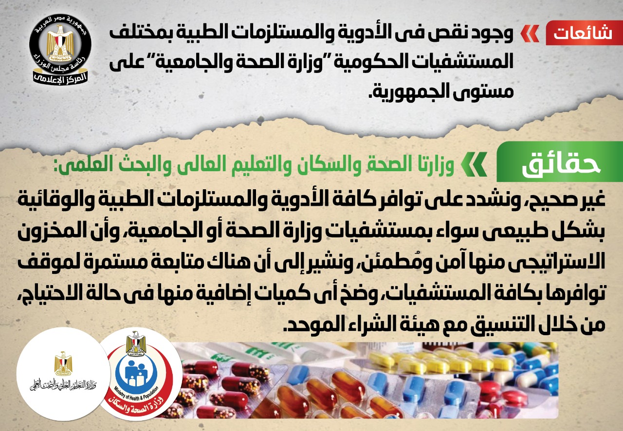 رصد المركز الاعلامي بمجلس الوزراء تداول أنباء بشأن وجود نقص في الأدوية والمستلزمات الطبية بمختلف المستشفيات الحكومية "وزارة الصحة والجامعية" على مستوى الجمهورية.