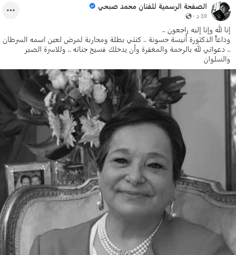 وكتب محمد صبحي منشورًا، عبر حسابها لشخصي بموقع التواصل الاجتماعي فيس بوك، قائلًا: إنا لله وإنا إليه راجعون.. وداعًا الدكتورة أنيسة حسونة.