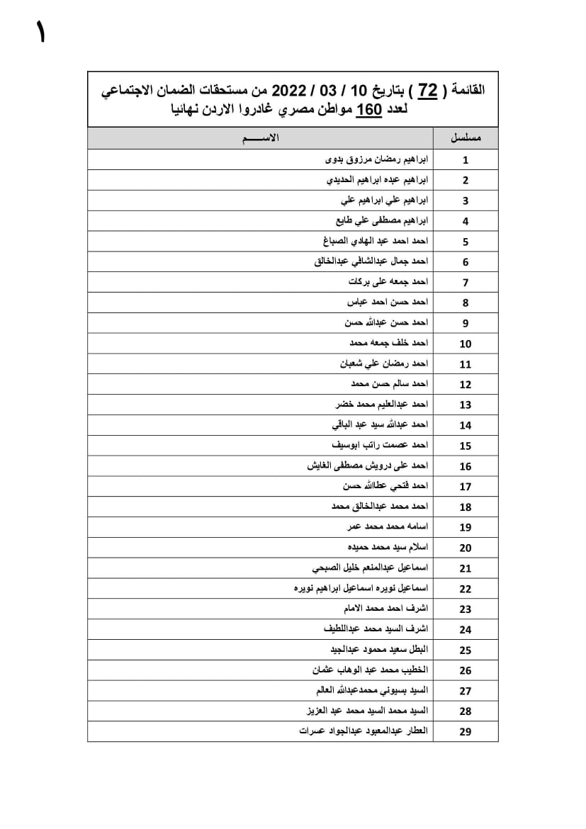 أعلن وزير القوى العاملة، محمد سعفان، أن مكتب التمثيل العمالي التابع للوزارة بالسفارة المصرية بعمان-الأردن، استطاع بالمتابعة اللحظية والجهود المبذولة والمقابلات مع المسئولين بمؤسسة الضمان الاجتماعي بالأردن، واستكمالا لما تم تحويله سابقا، تم تحويل القائمة الـ 72 من مستحقات الضمان الاجتماعي لنحو 160 عاملا مصريا لدى المؤسسة غادروا عمان نهائيا.