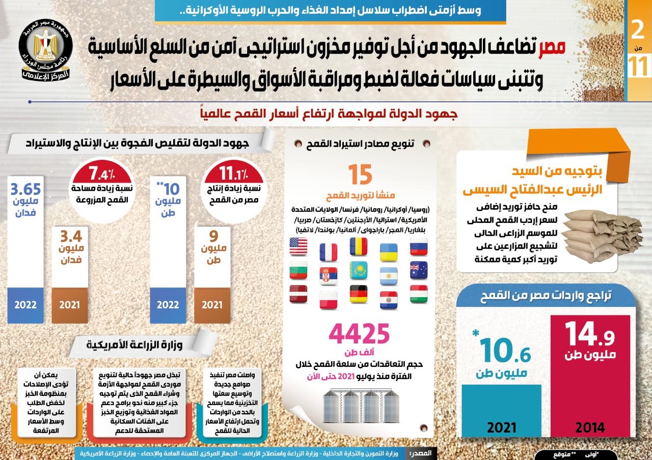 كما تشمل جهود الدولة لمواجهة ارتفاع أسعار القمح عالميًا، وفقًا للتقرير تنويع مصادر الواردات للقمح، حيث يوجد 15 منشأ لتوريد القمح وهم روسيا، وأوكرانيا، ورومانيا، وفرنسا، والولايات المتحدة الأمريكية، وأستراليا، والأرجنتين، وكازخستان، وصربيا، وبلغاريا، والمجر، وباراجواى، وألمانيا، وبولندا، ولاتفيا.