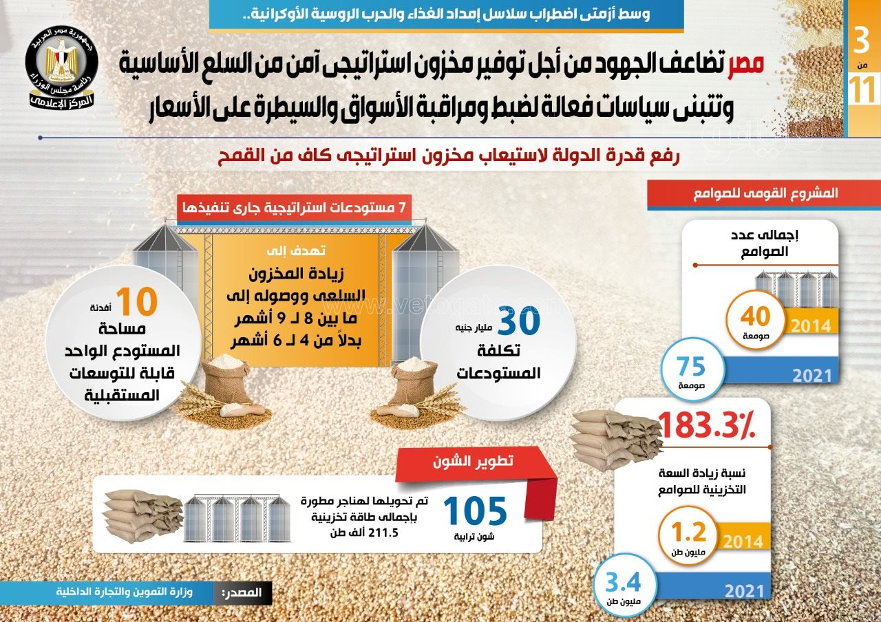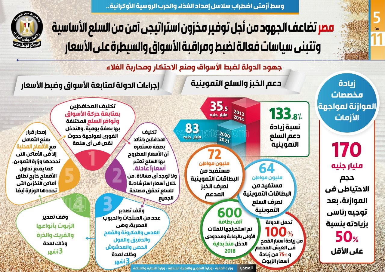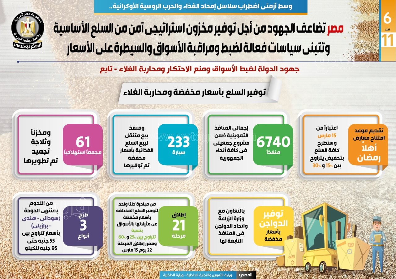 وفي هذا الصدد نشر المركز الإعلامي لمجلس الوزراء تقريرًا تضمن إنفوجرافات تسلط الضوء على جهود الدولة المصرية من أجل توفير مخزون استراتيجي آمن من السلع الأساسية، والسياسات الفعالة التي تتبناها لضبط الأسواق، والسيطرة على الأسعار في ظل الأزمات الحالية التي تعصف بالأسواق العالمية.