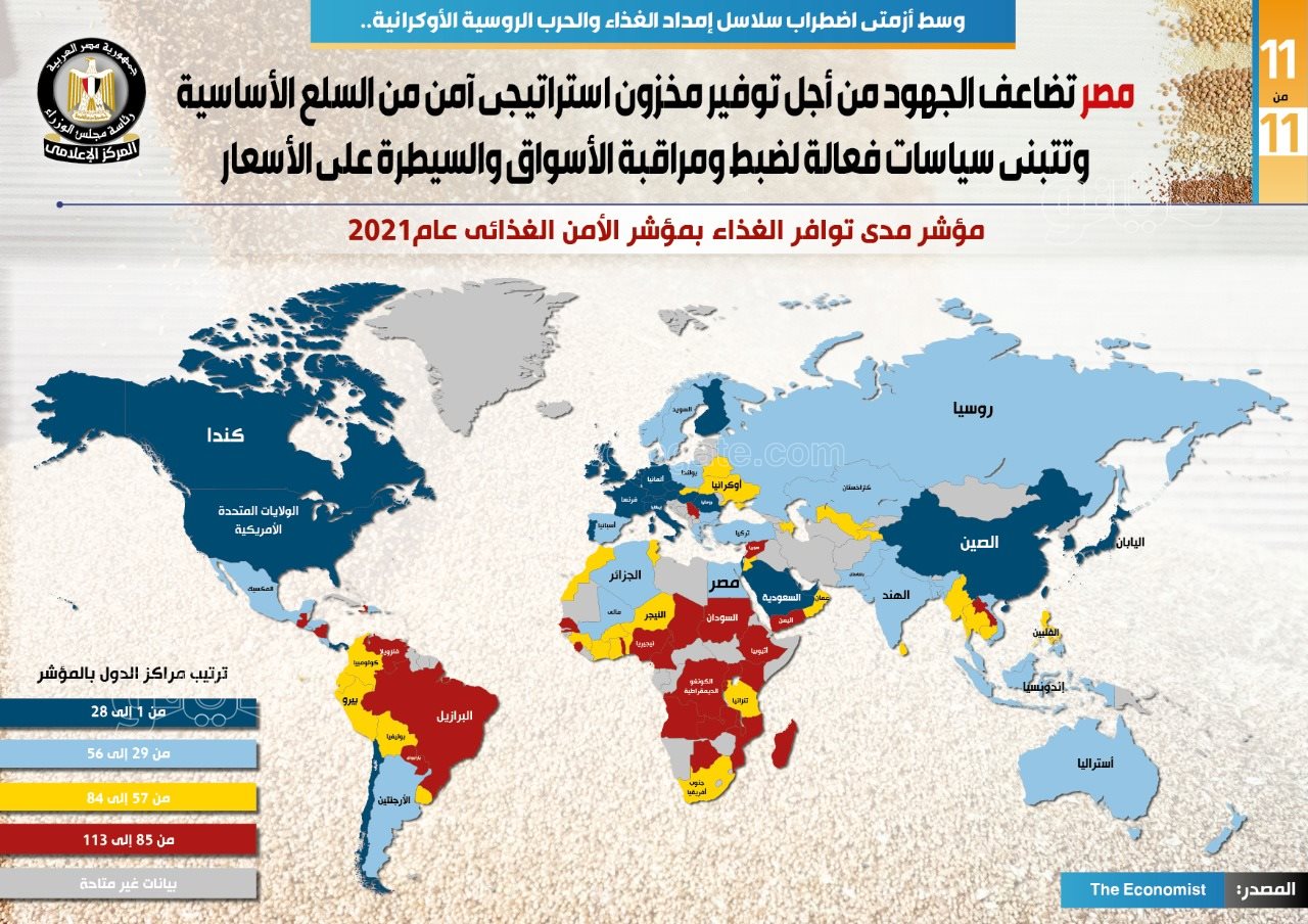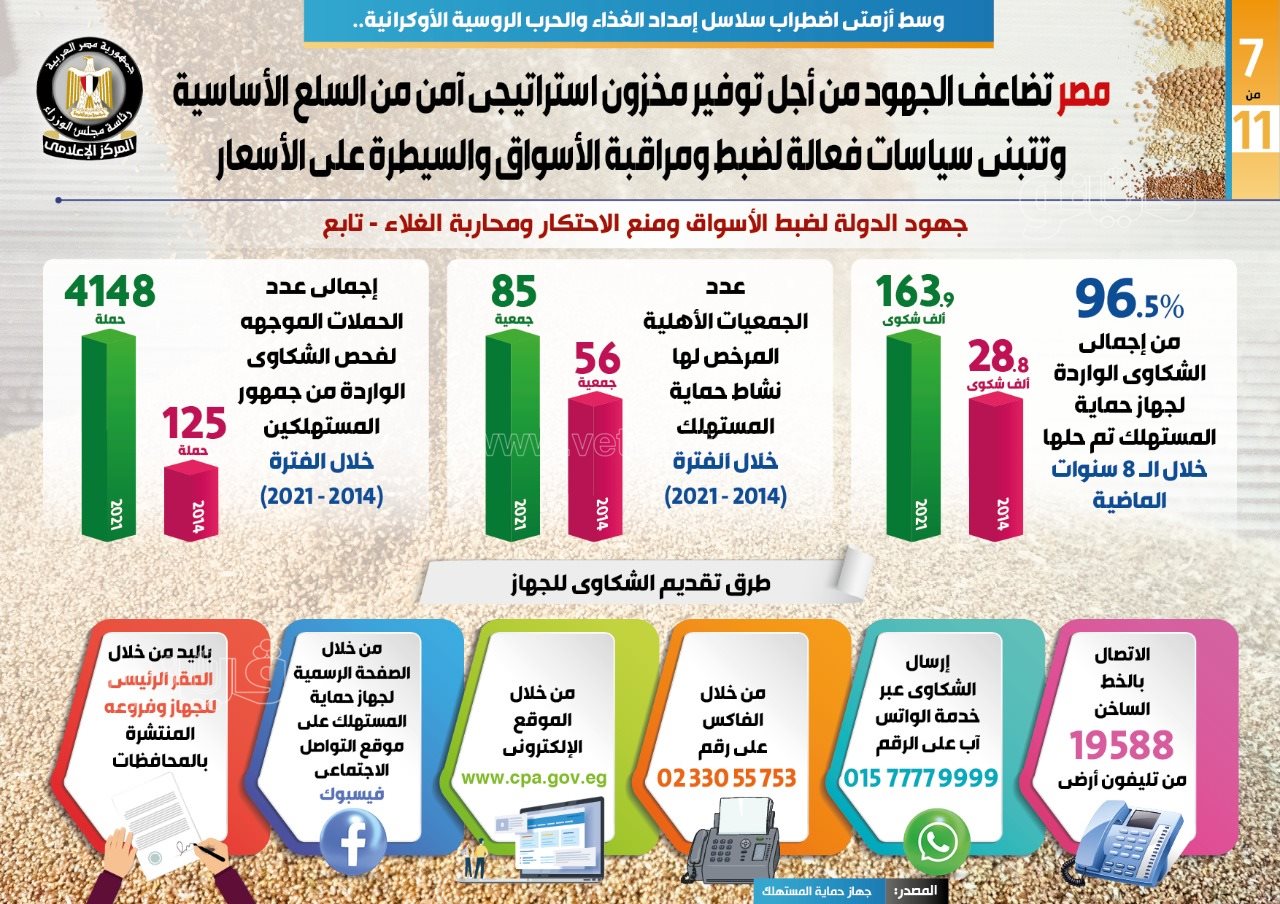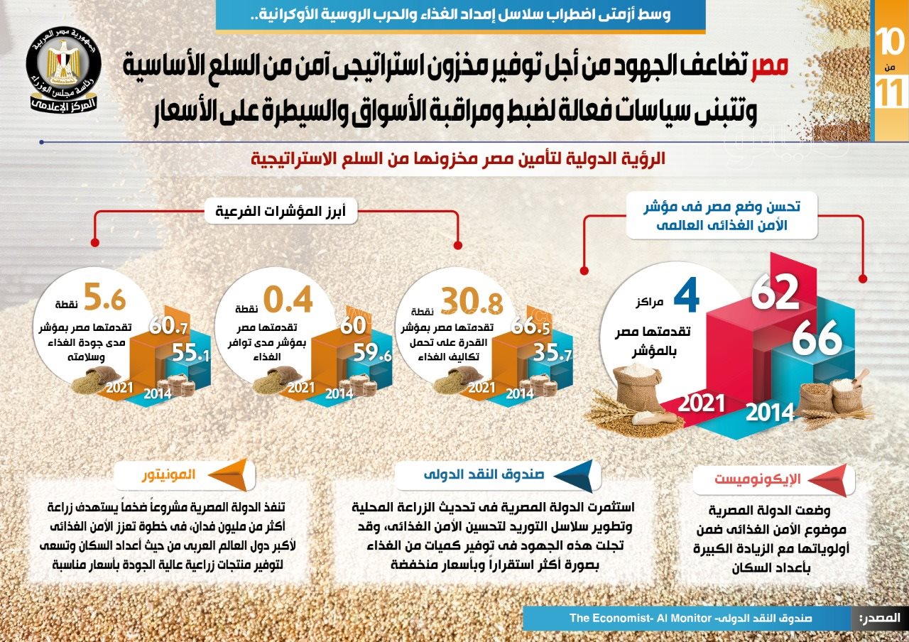 وفي هذا الصدد نشر المركز الإعلامي لمجلس الوزراء تقريرًا تضمن إنفوجرافات تسلط الضوء على جهود الدولة المصرية من أجل توفير مخزون استراتيجي آمن من السلع الأساسية، والسياسات الفعالة التي تتبناها لضبط الأسواق، والسيطرة على الأسعار في ظل الأزمات الحالية التي تعصف بالأسواق العالمية.