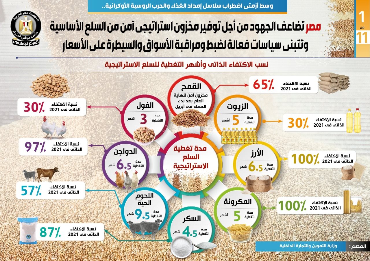أكد تقرير أصدره المركز الإعلامي بمجلس الوزراء صباح اليوم الإثنين أن نسب الاكتفاء الذاتي للسلع الاستراتيجية، ومدة تغطية هذه السلع حتى الآن، حيث بلغت نسبة الاكتفاء من القمح 65% كمخزون آمن لنهاية العام بعد بدء الحصاد في أبريل.