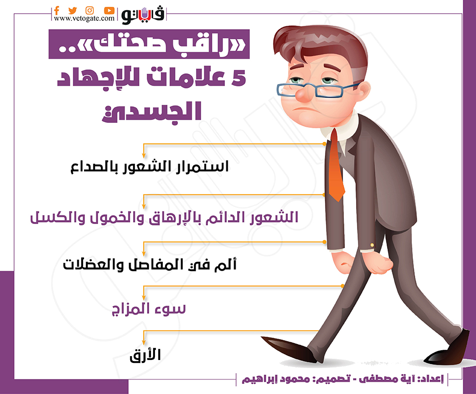 "راقب صحتك".. 5 علامات للإجهاد الجسدي| انفوجراف السبت 19/مارس/2022 - 03:36 م 3/19/2022 3:36:47 PM الإجهاد الجسدي آية مصطفى شارك طباعة 18 حجم الخط شارك طباعة الخمول والكسل الصداع الارهاق انفوجراف الكسل الارق