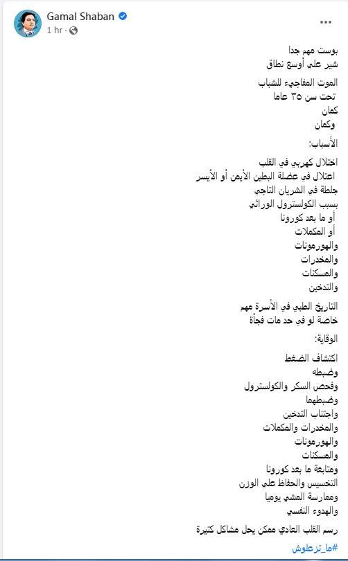 وكتب جمال شعبان تدوينة على الفيس بوك "الموت المفاجيء للشباب تحت سن ٣٥ عاما، كمان وكمان، الأسباب: اختلال كهربي في القلب، اعتلال في عضلة البطين الأيمن أو الأيسر، جلطة في الشريان التاجي بسبب الكولسترول الوراثي أو ما بعد كورونا أو المكملات والهرمونات والمخدرات والمسكنات والتدخين.. التاريخ الطبي في الأسرة مهم خاصة لو في حد مات فجأة"