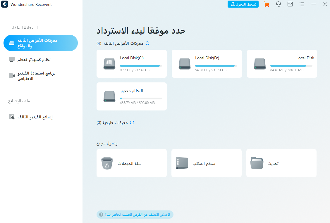 الخطوة الأولى: قم بتشغيل برنامج Recoverit عبر الضغط على أيقونة البرنامج في سطح المكتب أو مسار المجلد الموجود فيه البرنامج.