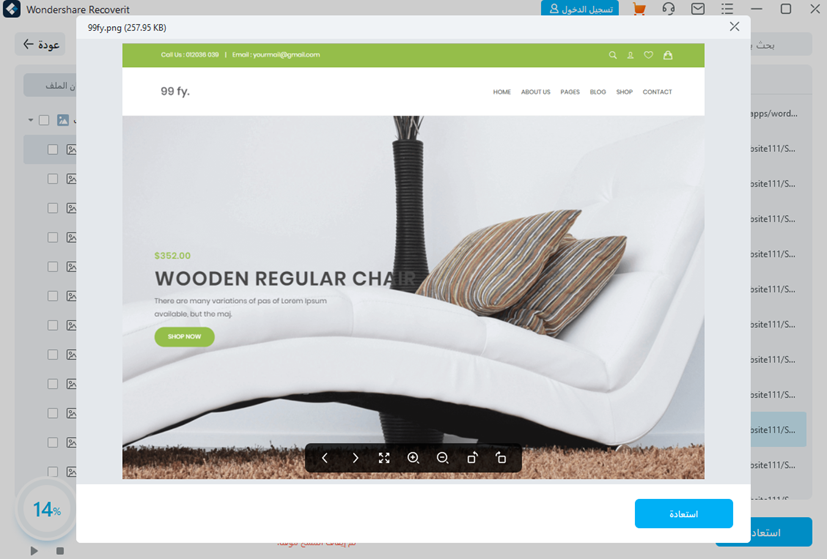الخطوة الثالثة: عند النقر على الصور الموجودة في النتائج ستظهر لك شاشة المعاينة للتأكد من انها الصورة التي ترغب في استرجاعها، بعد ذلك قم بالضغط على زر " استعادة "، ومن ثم قم بتحديد مسار حفظ الصورة سوآءا على جهاز الكمبيوتر أو قرص خارجي.