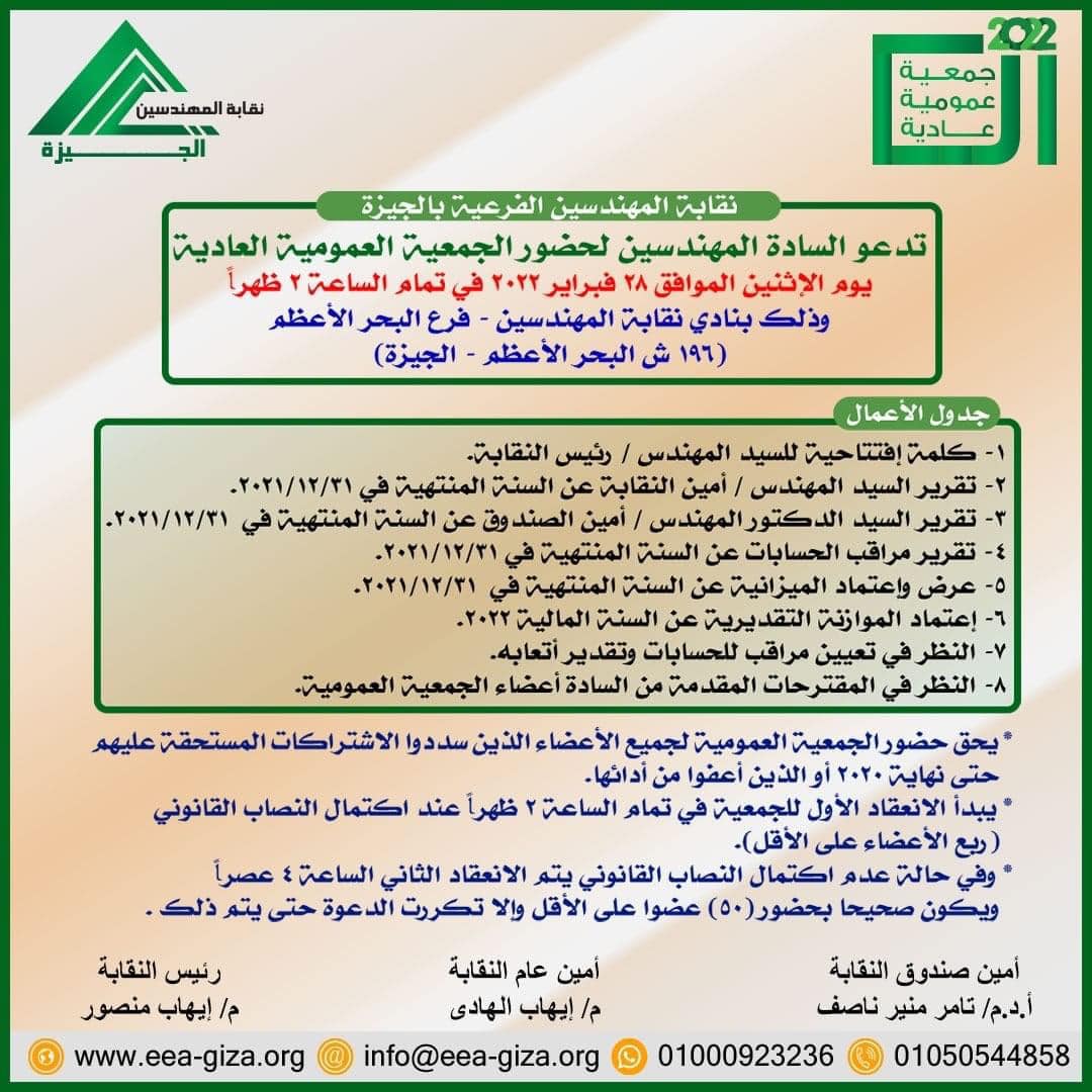 وأشارت نقابة المهندسين بالجيزة إلى أن من يحق لهم حضور الجمعية العمومية جميع الأعضاء الذين سددوا الاشتراكات المستحقة عليهم حتى نهاية 2020 أو الذين أعفو من أدائها.