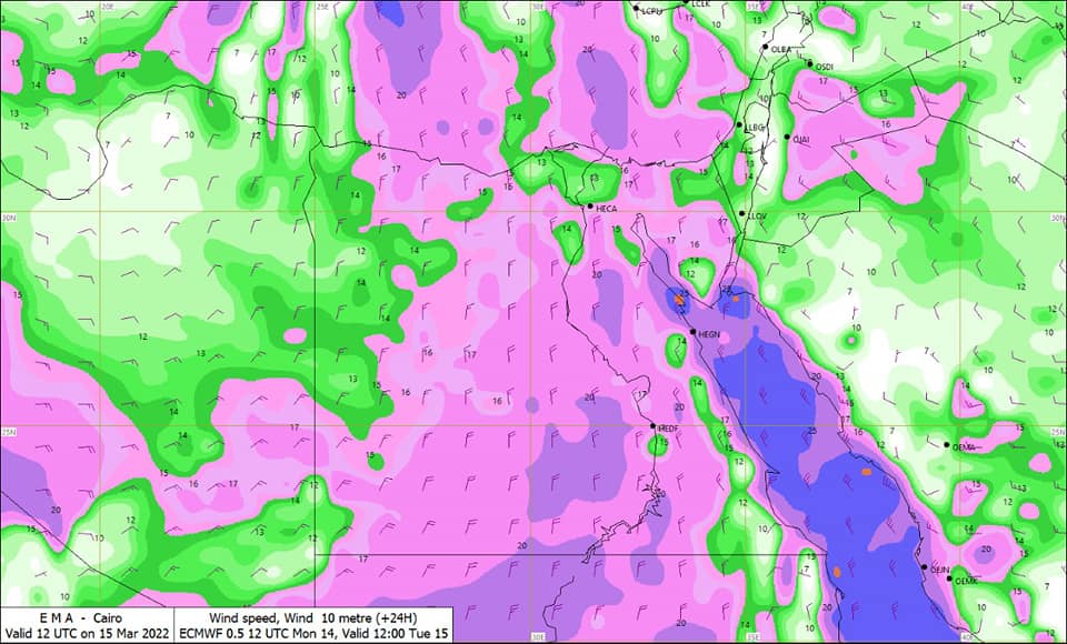 كما تنشط الرياح على مسطح البحر الأحمر، مما يؤدى إلى اضطراب حركة الملاحة البحرية هناك وارتفاع الموج (٤:٣ متر).