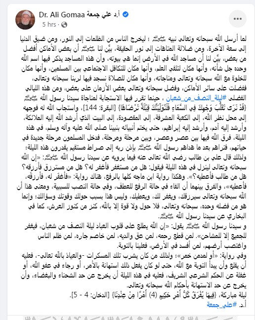 وكتب الدكتور علي جمعة تدوينة على الفيس بوك "لما أرسل الله سبحانه وتعالى نبيه ﷺ ؛ ليخرج الناس من الظلمات إلى النور، ومن ضيق الدنيا إلى سعة الآخرة، ومن ضلالة المتاهات إلى نور الحقيقة، بيَّن لنا ﷺ أن بعض الأماكن أفضل من بعض، بيَّن لنا أن مساجد الله في الأرض إنما هي بيوته، وأن هذه المساجد يذكر فيها اسم الله وحده جل شأنه، وأنها مكان لتلقي العلم، وأنها مكان للتكافل الاجتماعي بين المسلمين، وأنها مكان للخلوة مع الله سبحانه وتعالى ومناجاته، وأنها مكان للصلاة نسجد فيها لربنا سبحانه وتعالى، ففضلت على سائر الأماكن"