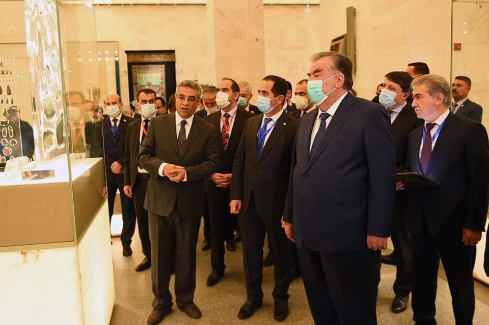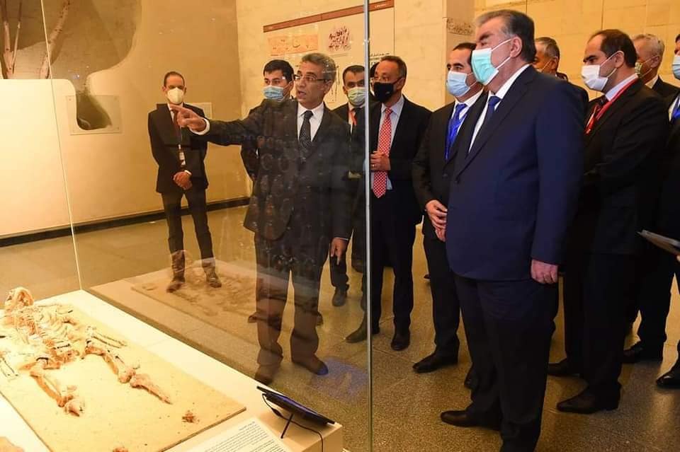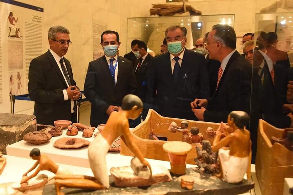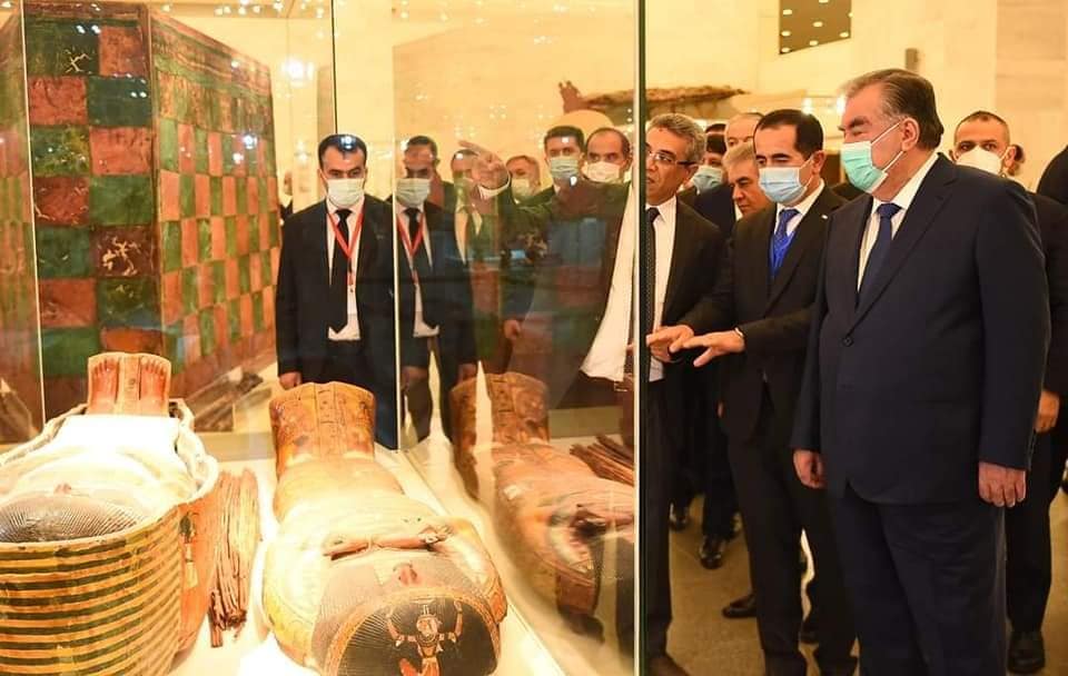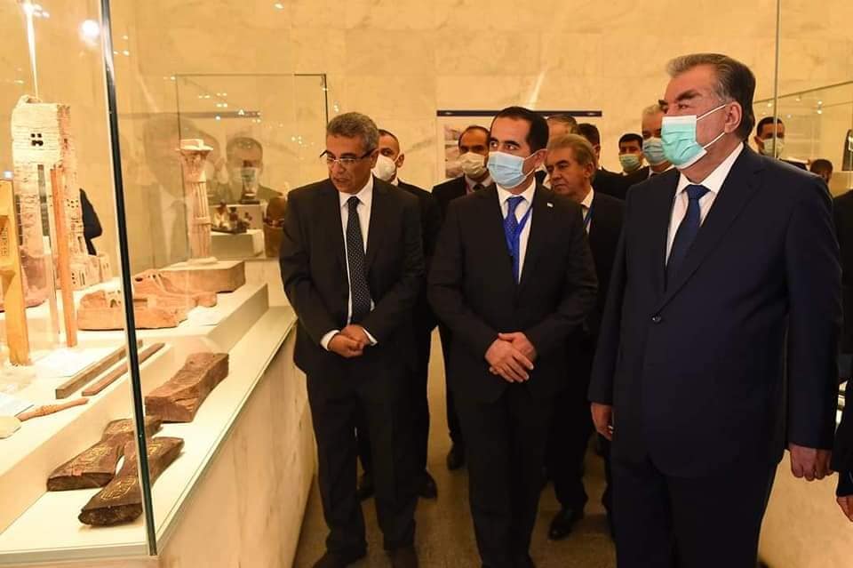 وكان في استقبال رئيس جمهورية طاجيكستان مؤمن عثمان رئيس قطاع المتاحف بالمجلس الأعلى للآثار والدكتور أحمد فاروق غنيم رئيس هيئة المتحف القومي للحضارة المصرية، اللذان اصطحباه في جولة داخل أروقة المتحف وقاعاته المختلفة وقدما له شرح وافي عن القطع والكنوز الأثرية المعروضة داخل قاعاته.