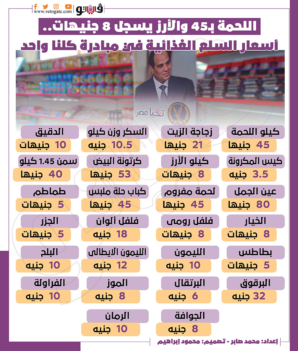 اللحمة بـ45 والأرز يسجل 8 جنيهات.. أسعار السلع الغذائية في مبادرة كلنا واحد | إنفوجراف الثلاثاء 15/مارس/2022 - 06:55 م 3/15/2022 6:55:12 PM مبادرة كلنا واحد محمد صابر شارك طباعة 18 حجم الخط شارك طباعة السلع الغذائية تخفيضات على السلع كرتونة البيض التخفيضات علي السلع زجاجة الزيت