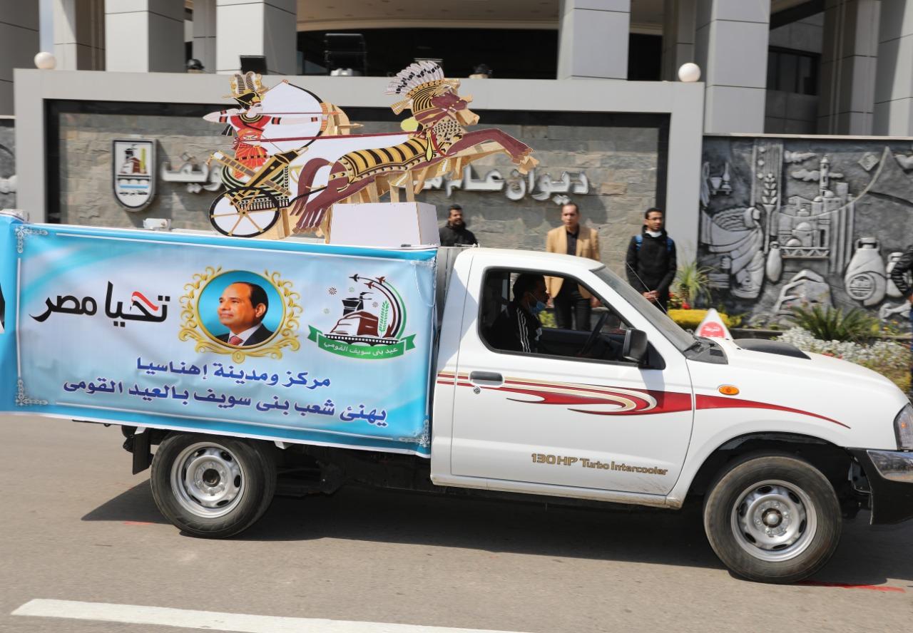 ثم عرض سيارة اهناسيا وعليها نموذج مجسم للعجلة الحربية، وتوجد بمدخل المدينة وتشكل لوحة فنية رائعة،وترمز إلى الأهمية الحضارية لاهناسيا، تلتها عرض سيارة الوحدة المحلية لمركز ومدينة ببا، عليها مجسم لمحطة الكهرباء بغياضة، أحد أهم المشروعات القومية المنفذة بصعيد مصر في عهد الرئيس عبد الفتاح السيسي، وتعمل بأحدث التكنولوجيات المتاحة عالميا، لتأتي بعدها سيارة حاملة مجسم لمسلة فرعونية، تجسد المكانة التاريخية لمدينة سمسطا التي يوجد بها مقبرتا "أنتي وشدو" من الأسرة الخامسة، فيما حملت سيارة الفشن مجسم لصورة الشيخ طه الفشنى أحد أعلام الابتهالات والتلاوة في مصر والعالم الإسلامي والذي تم وضعه ضمن قائمة ممشى العظماء بالكورنيش السفلي الذي تم افتتاحه اليوم.
