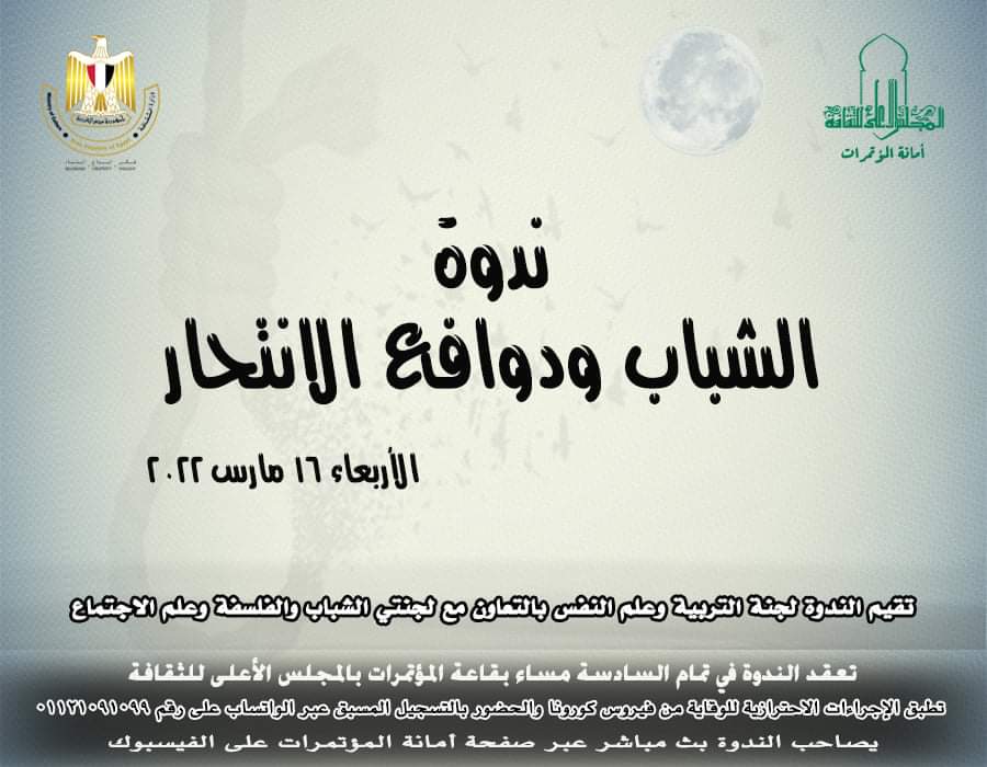 يعقد المجلس الأعلى للثقافة بأمانة الدكتور هشام عزمي، ندوة "الشباب ودوافع الانتحار"، والتي تنظمها لجنة التربية وعلم النفس بالمجلس برئاسة الدكتور محمد أمين المفتي مقرر لجنة التريية وعلم النفس؛ بالتعاون مع لجنة الشباب برئاسة الدكتورة منى الحديدي؛ ولجنة الفلسفة وعلم الاجتماع برئاسة الدكتور أحمد مجدي حجازي.