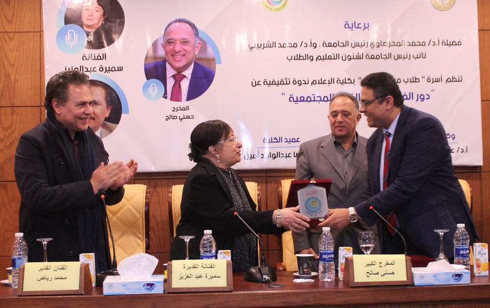 نظمت أسرة طلاب من أجل مصر بإعلام الأزهر برعاية الدكتور محمد المحرصاوى رئيس الجامعة ندوة تثقيفية عن "دور الفن في إبراز القيم المجتمعية" تحدث فيها ثلاثة من رموز الفن المصري، المخرج القدير حسني صالح، والفنانة سميرة عبد العزيز، والفنان محمد رياض، بقاعة المؤتمرات بالكلية، بحضور الدكتور محمد الشربيني نائب رئيس جامعة الأزهر لشئون التعليم والطلاب والدكتور رضا عبد الواجد أمين عميد كلية الإعلام، والدكتور عبد الراضي حمدي البلبوشي وكيل الكلية، ولفيف من أعضاء هيئة التدريس وطلاب الكلية.