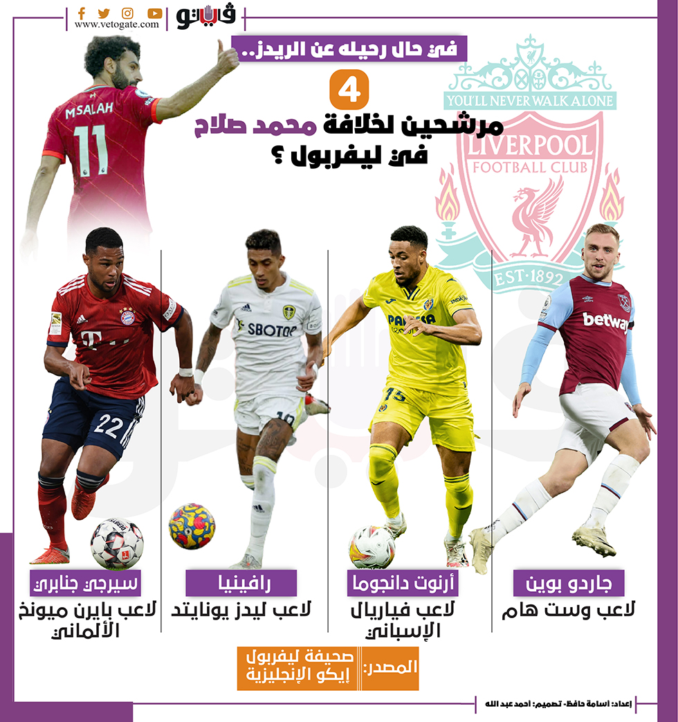 في حال رحيله عن الريدز.. 4 مرشحين لخلافة محمد صلاح في ليفربول ؟ | انفو جراف الأربعاء 16/مارس/2022 - 09:40 م 3/16/2022 9:40:54 PM محمد صلاح اسامة حافظ شارك طباعة 18 حجم الخط شارك طباعة بايرن ميونخ الالماني جنابري ليفربول صلاح ليفربول ايكو