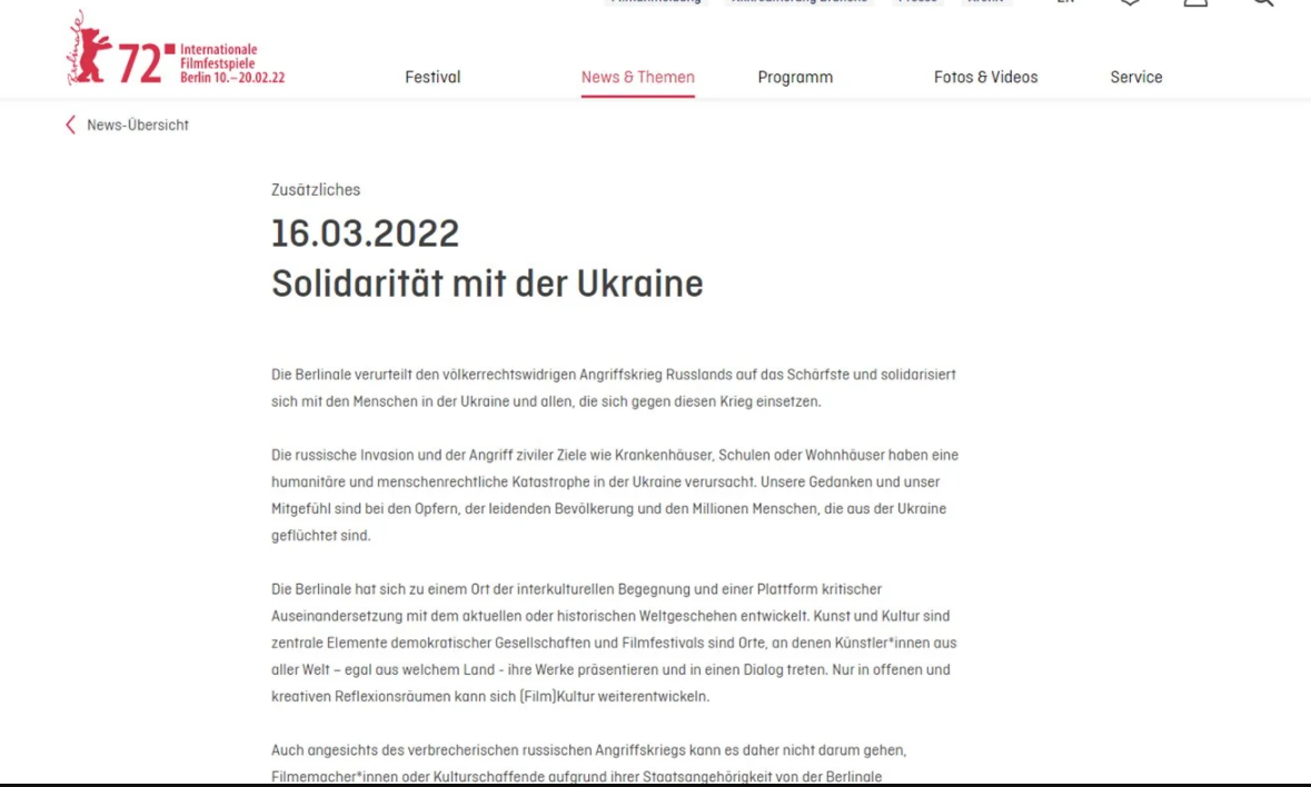 وفصل بيان مهرجان برلين السينمائي بين الحكومة الروسية والمبدعين الروس، موضحًا في بيانه أنه لا يمكن استبعاد صانعي الأفلام أو العاملين في المجال الثقافي من مهرجان برلين على أساس جنسيتهم، أو عزلهم في كثير من الأحيان، فإن أعمالهم بالتحديد هي التي تنقل انتقادات الأنظمة وبالتالي يتخذ مهرجان برلين موقفًا واضحًا ضد المقاطعة العامة للأعمال الثقافية على أساس أصلها، حيث سيؤدي ذلك أيضًا إلى قمع العديد من الأصوات الناقدة والعالم بحاجة إلى تلك الأصوات الناقدة، الأمر مختلف عن استبعاد مؤسسات الدولة الرسمية، وفي هذه الحالة، المؤسسات أو الوفود الروسية وكذلك الجهات الداعمة للنظام من المشاركة في المهرجان طالما أن الحكومة الروسية تشن هذه الحرب الوحشية ضد أوكرانيا، وتمني مهرجان برلين في ختام بيانه إنهاء العدوان الروسي وإحلال السلام في أوكرانيا.
