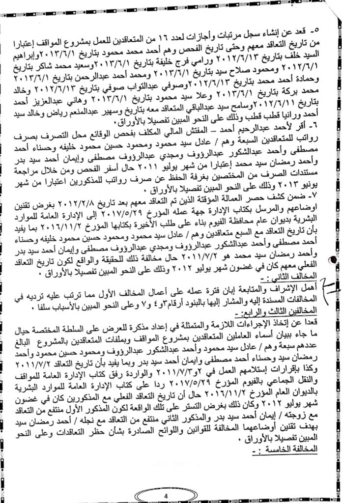 ولم يقم بإنشاء سجل مرتبات وأجازات لعدد 16 من المتعاقدين للعمل بمشروع المواقف، وأقر للمفتش المالي بفحص وقائع صرف رواتب للمتعاقدين بالمخالفة للحقيقة، وقام بتضمين كشف حصر العمالة المؤقتة الذين تم التعاقد معهم بعد تاريخ 8 فبراير عام 2012، بقصد تقنين أوضاعهم والمرسل للإدارة العامة للموارد البشرية بديوان عام المحافظة في 29 مايو عام 2017، وأثبت به تاريخ التعاقدات بالمخالفة للحقيقة.