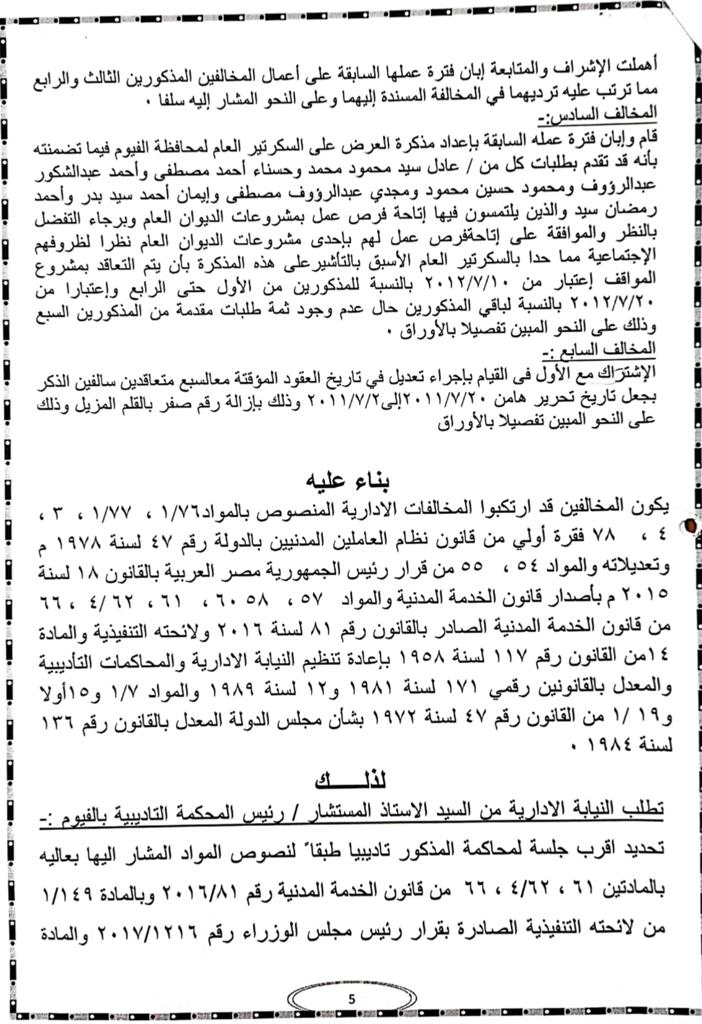 وأهملت عفاف محمد الصوفي، مدير الإدارة العامة للموارد البشرية بديوان عام محافظة الفيوم في الإشراف والمتابعة على أعمال المحالين الثالث والرابع مما ترتب عليه ارتكابهما المخالفة المسندة إليهما.
