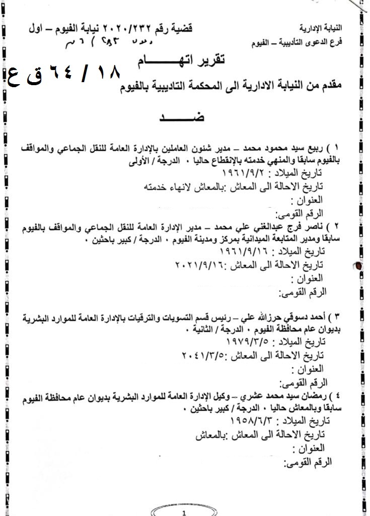 وكان تقرير قضائي مهم منسوب للنيابة الإدارية في القضية رقم 18 لسنة 64 قضائية عليا أزاح الستار عن قضية فساد مالي وإداري من العيار الثقيل داخل ديوان محافظة الفيوم أحيل على إثرها 7 مسئولين من قيادات الإدارات العامة للموارد البشرية والنقل الجماعي والمواقف للمحاكمة بعد ثبوت التلاعب في تعاقدات الموظفين، ومنهم أبنائهم وزوجاتهم رغم حظرها بقرارات سيادية وتعليمات وزارة المالية والجهاز المركزي للتنظيم والإدارة.