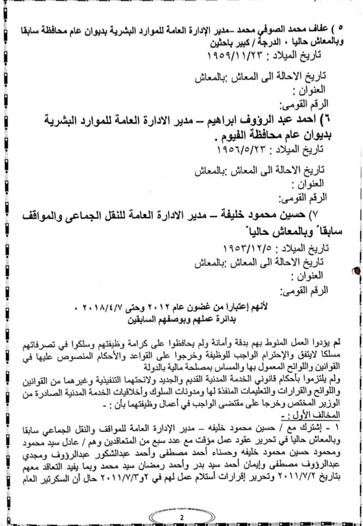 وتقاعس كل من أحمد دسوقي علي، رئيس قسم التسويات والترقيات بالإدارة العامة للموارد البشرية بديوان عام محافظة الفيوم، ورمضان سيد محمد، وكيل الموارد البشرية بالمحافظة عن اتخاذ إجراءات إعداد مذكرة للعرض على السلطة المختصة حيال ما جاء ببيان أسماء العاملين المتعاقدين بمشروع المواقف وبملفاتهم البالغ عددهم 7 أشخاص.