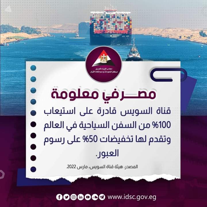 نشر مركز المعلومات ودعم اتخاذ القرار بمجلس الوزراء عبر صفحته الرسمية على موقع التواصل الاجتماعي فيسبوك، إنفوجرافًا بشأن قدرة قناة السويس على استيعاب مرور السفن والتسهيلات التي تقدمها هيئة قناة السويس للسفن المارة.